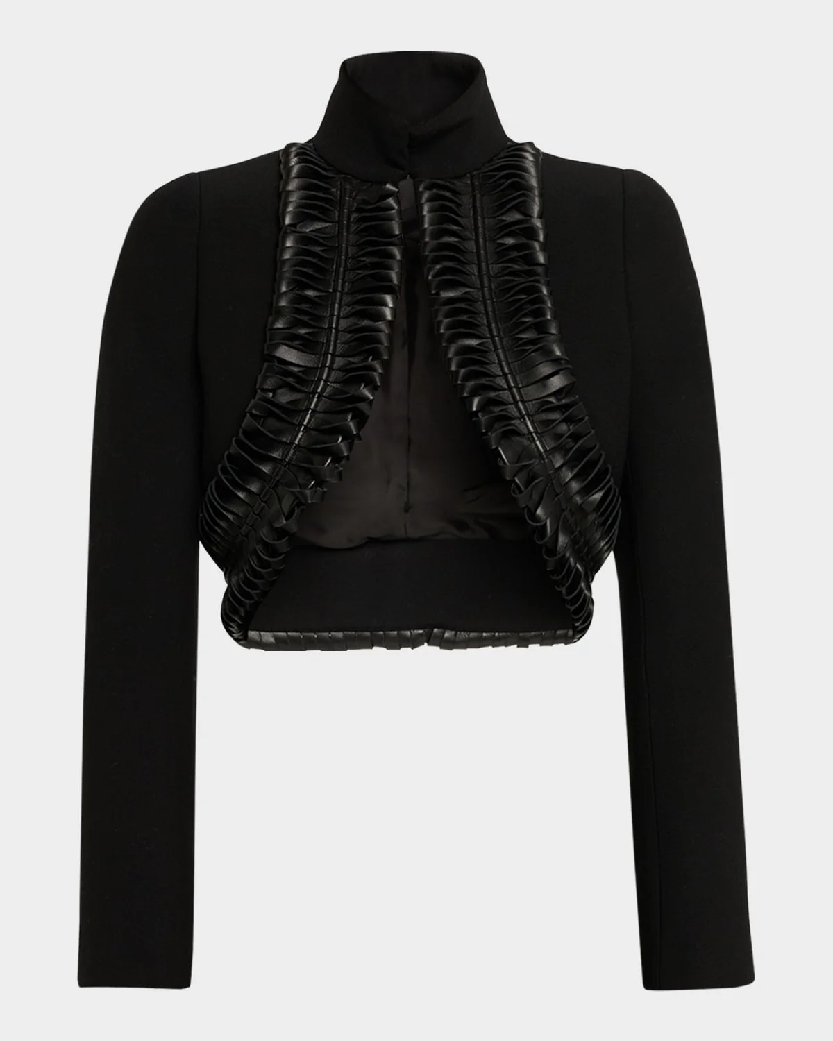 This doublefaced woolblend jacket by ALAIA features a triangular cutaway front opening and sculptural faux leather trim High neckline Long sleeves Slim fit Cropped hem Polyester/wool/elastane Lining: Cupro Dry clean Made in Italy