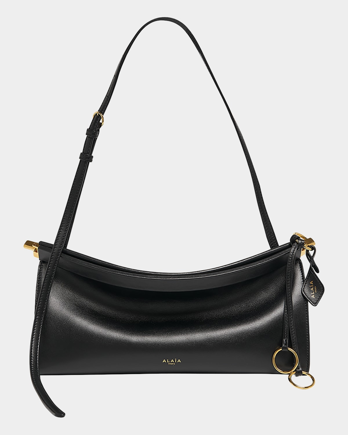 - ALAIA "Le Click" east-west shoulder bag in glossy leather - Adjustable shoulder strap - Can be worn as a shoulder or belt bag - Frame top with side hinges; keyring tags - Lining: Leather - Approx. 5.5"H x 11.8"W x 3.5"D - Made in Italy