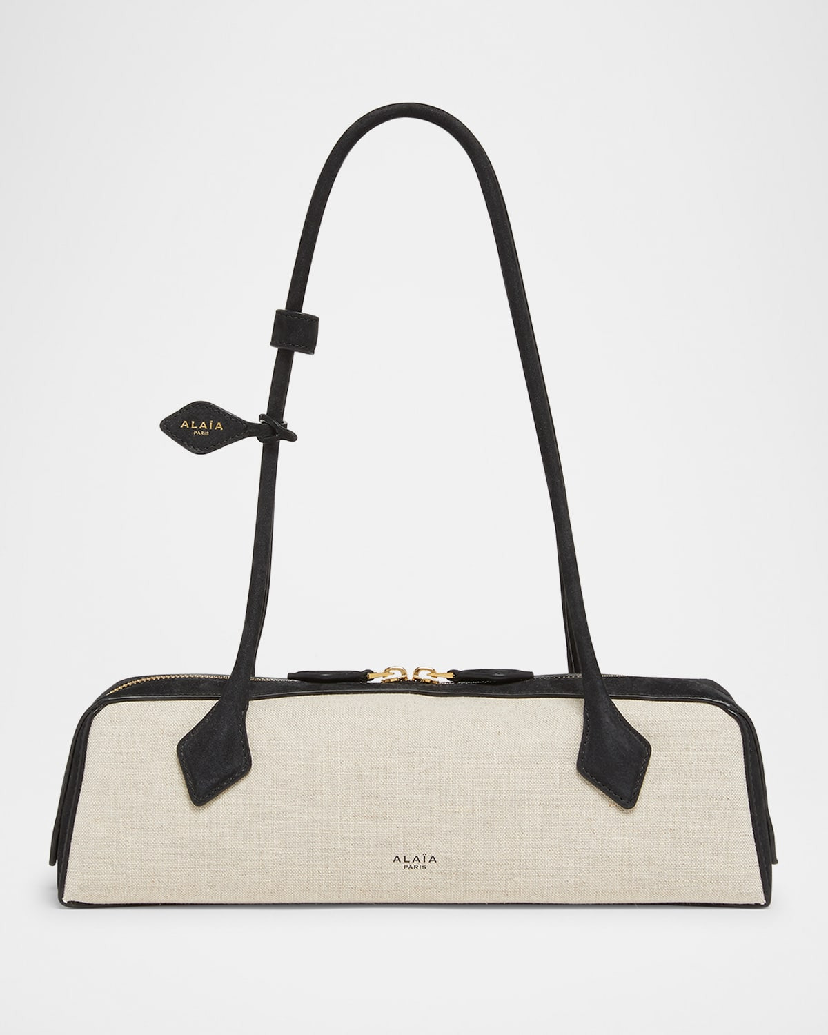 - ALAIA "Le Teckel" medium shoulder bag crafted in linen-cotton canvas and nubuck leather - Rolled shoulder straps - Removable logo-print tag - Two-way zip top closure - Lining: Leather - Approx. 4.3"H x 13"W x 3.9"D - Professional cleaning recommended - Made in Italy
