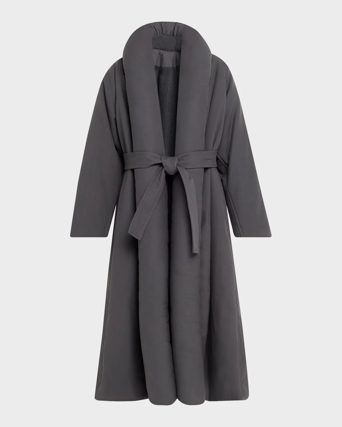 ALAIA wrap coat is structured with padded lapels and cinched at the waist with a self waist sash Shawl collar; open front Long sleeves Self-tie belted waist Oversized fit Full length Cotton Lining: Wool Fill: Down Dry clean Made in Italy