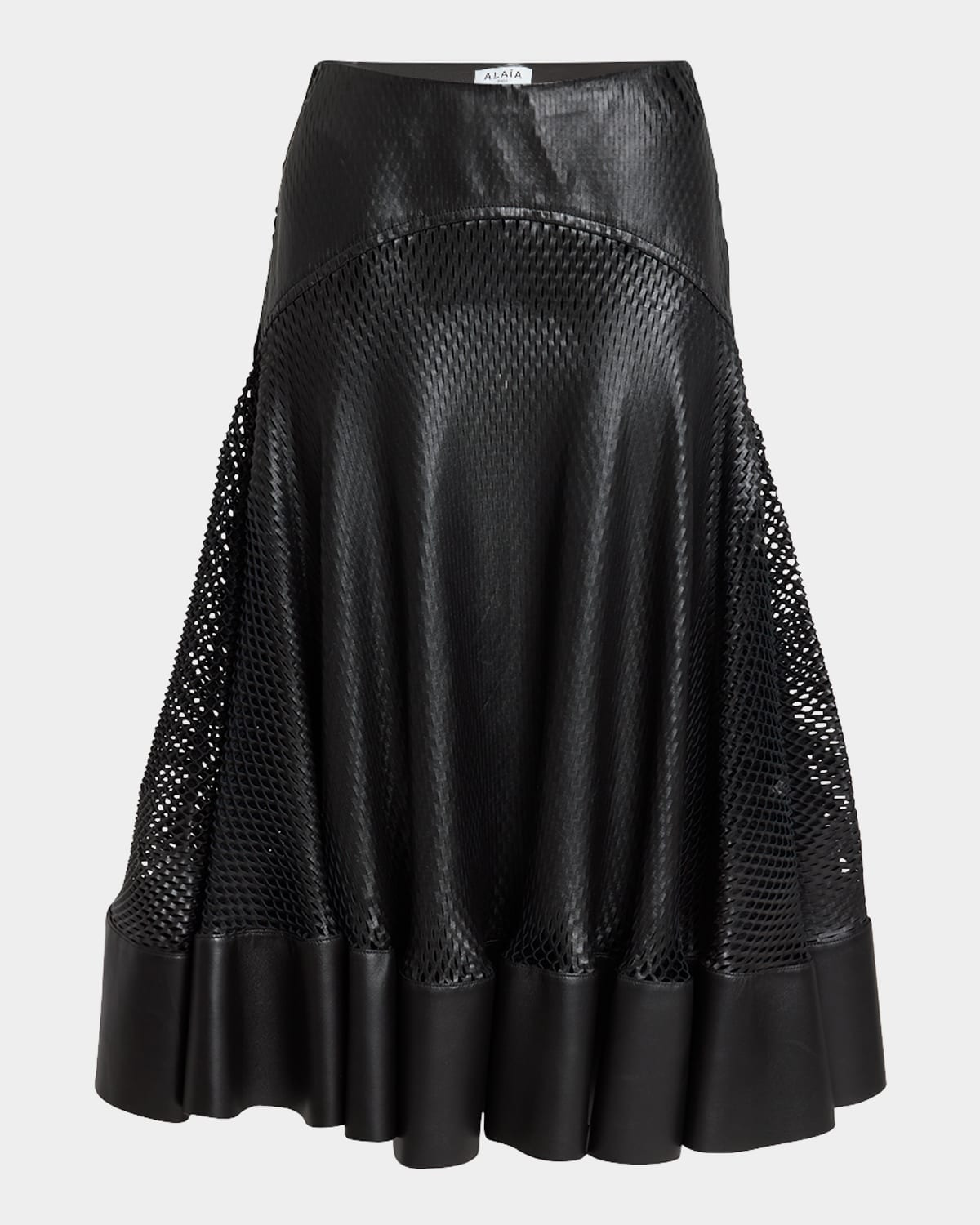 Finished with a clean, plain hem and curved waist panel, this smooth calf leather skirt by ALAIA is textured with perforated detailing High waist Hem falls below the knee Aline silhouette Invisible side zipper Leather Made in Italy