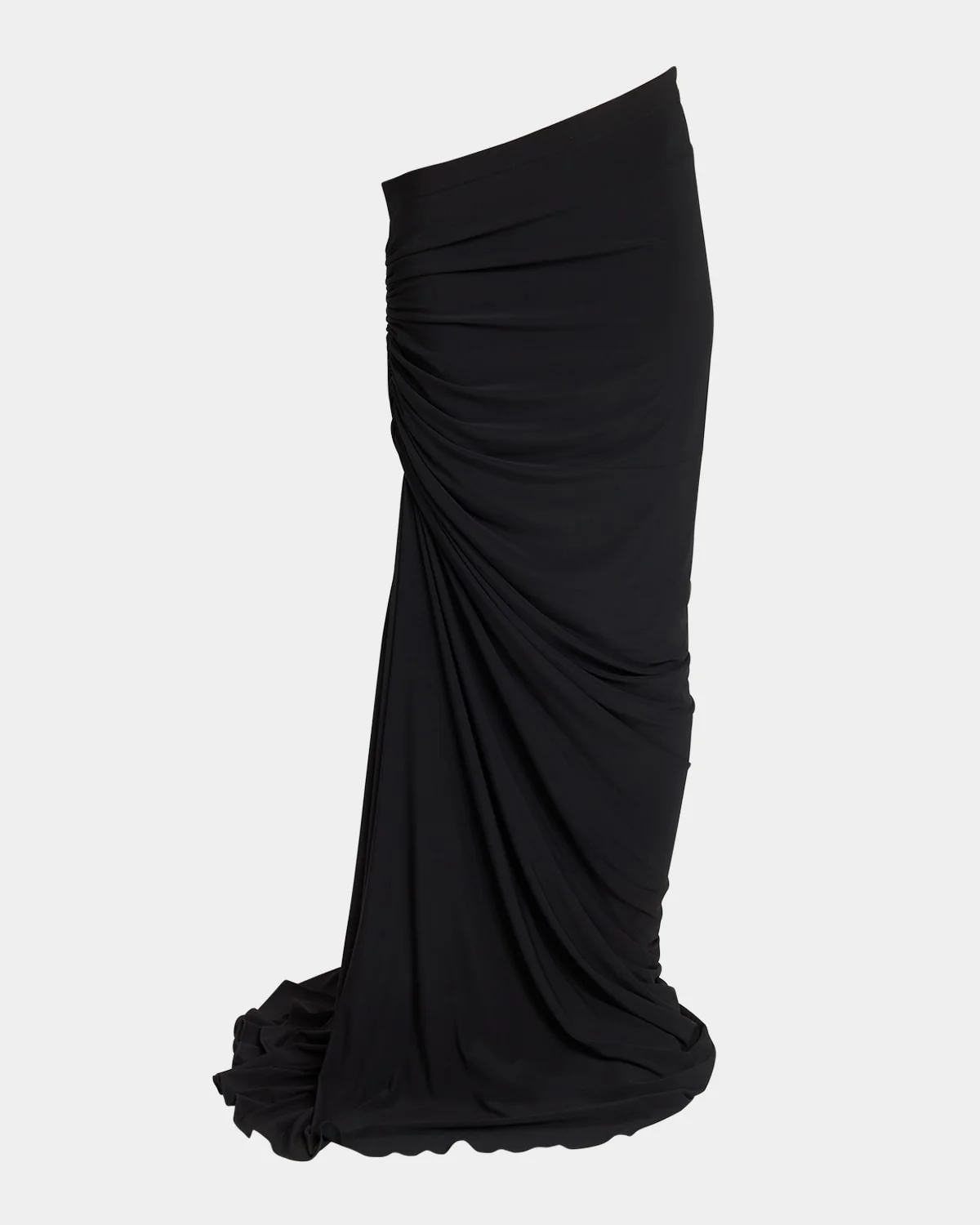 - ALAIA skirt accented with a flattering ruched side detail - High rise - Draped silhouette - Full length - Slip-on style - Viscose/elastane - Made in France