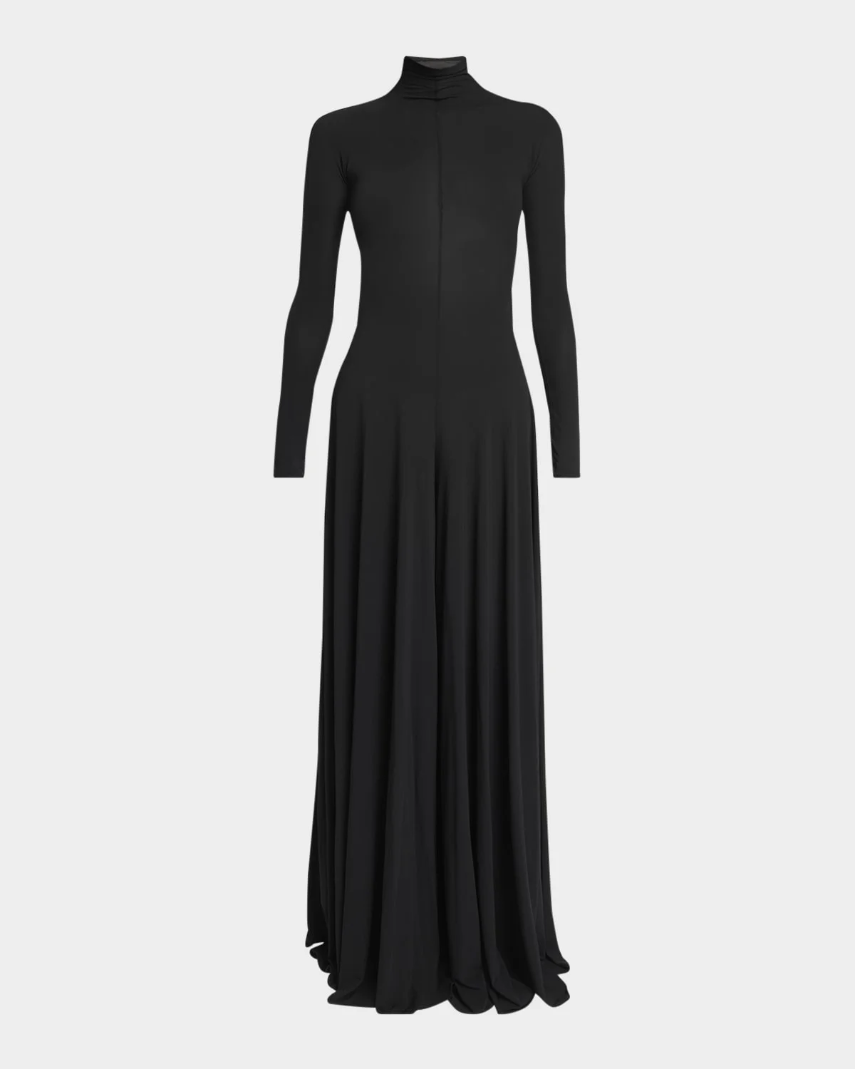 - ALAIA sheer jumpsuit enhanced with an open back - Turtleneck - Long sleeves - Fitted bodice - Exaggerated wide legs - Floor-sweeping hem - Step-in style - Viscose/elastane - Made in Italy