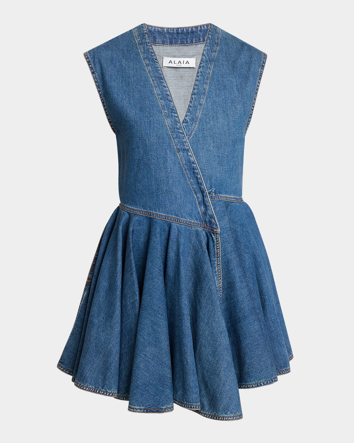 - ALAIA denim mini dress enhanced with an asymmetric front - V neckline - Sleeveless - Side seam pockets - Wrap silhouette - Hem falls above the knee - Side closure - Cotton - Lining: Cotton/polyester - Made in Italy