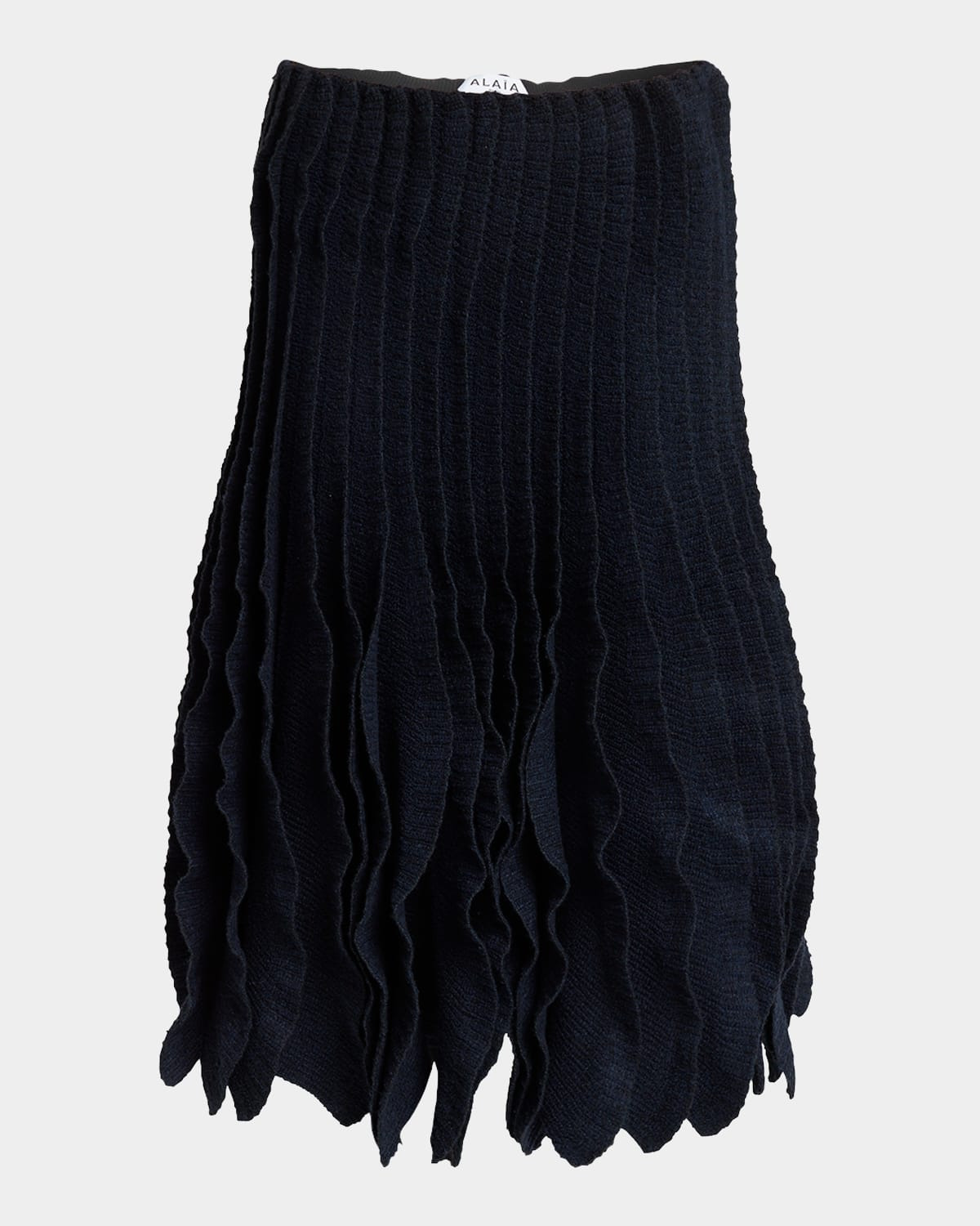 Knit with a tweed effect, this midlength skirt by ALAIA features relief frills with pleated volume throughout Lowrise elastic waistband Hem falls below the knee Aline silhouette Slipon style Silk/wool Dry clean Made in Italy
