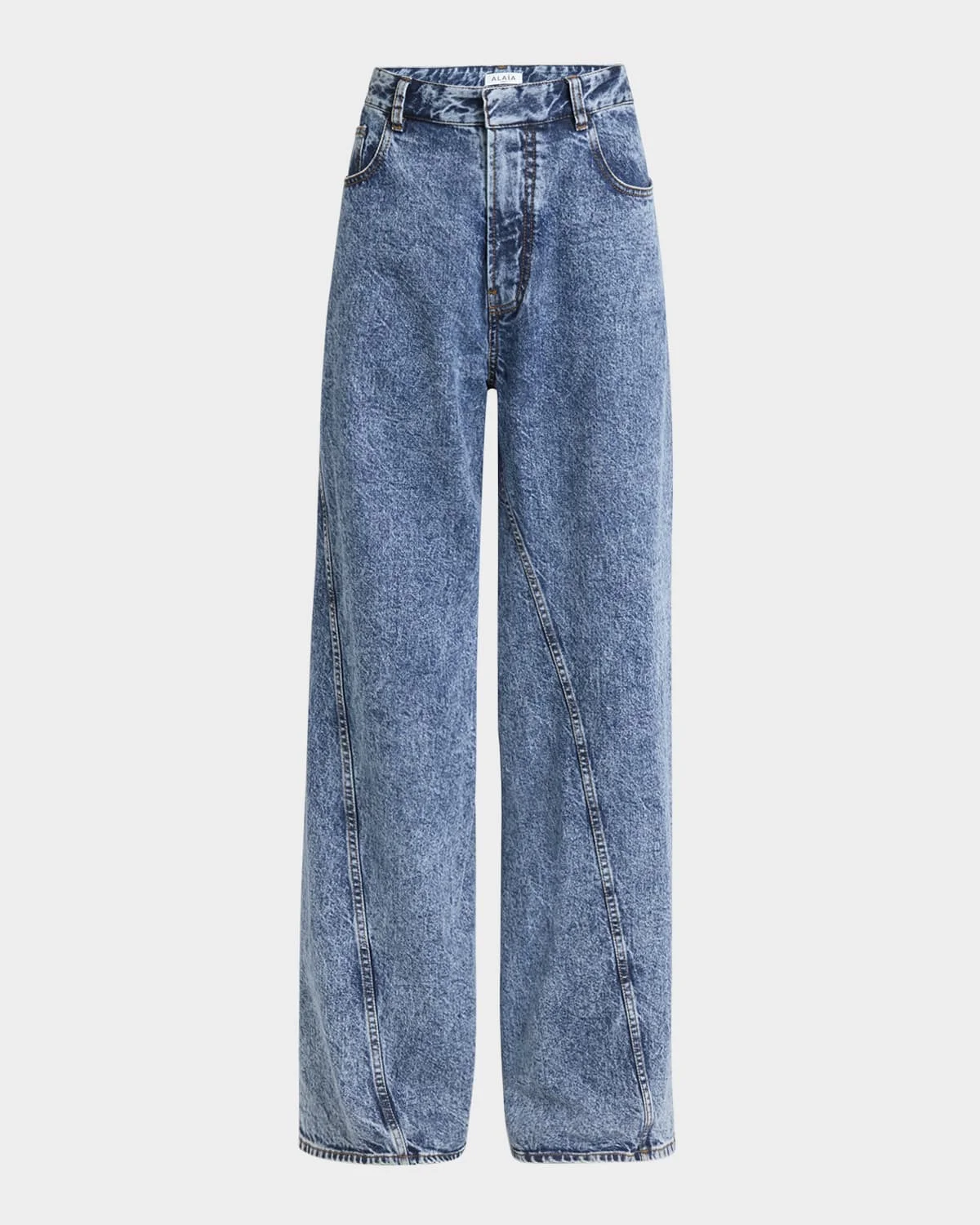 - ALAIA acid-wash denim jeans featuring a twisted hem seaming detail - High rise - Five-pocket style - Wide legs - Full length - Hook/zip fly; belt loops - Cotton/polyurethane - Dry clean - Made in Italy
