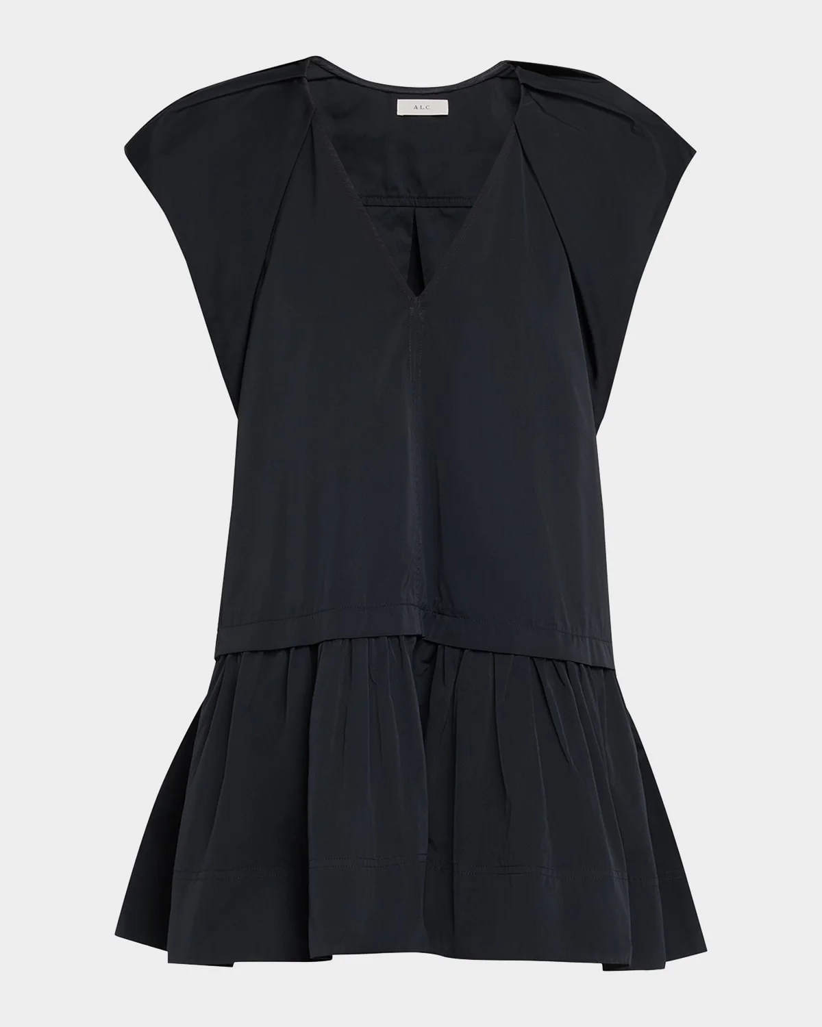 A.L.C. "Ember" mini dress adorned with flared, pleated sleeves and a flounce hem V neckline Short sleeves Dropwaist silhouette Hem falls above the knee Slipover style Polyester Dry clean Imported