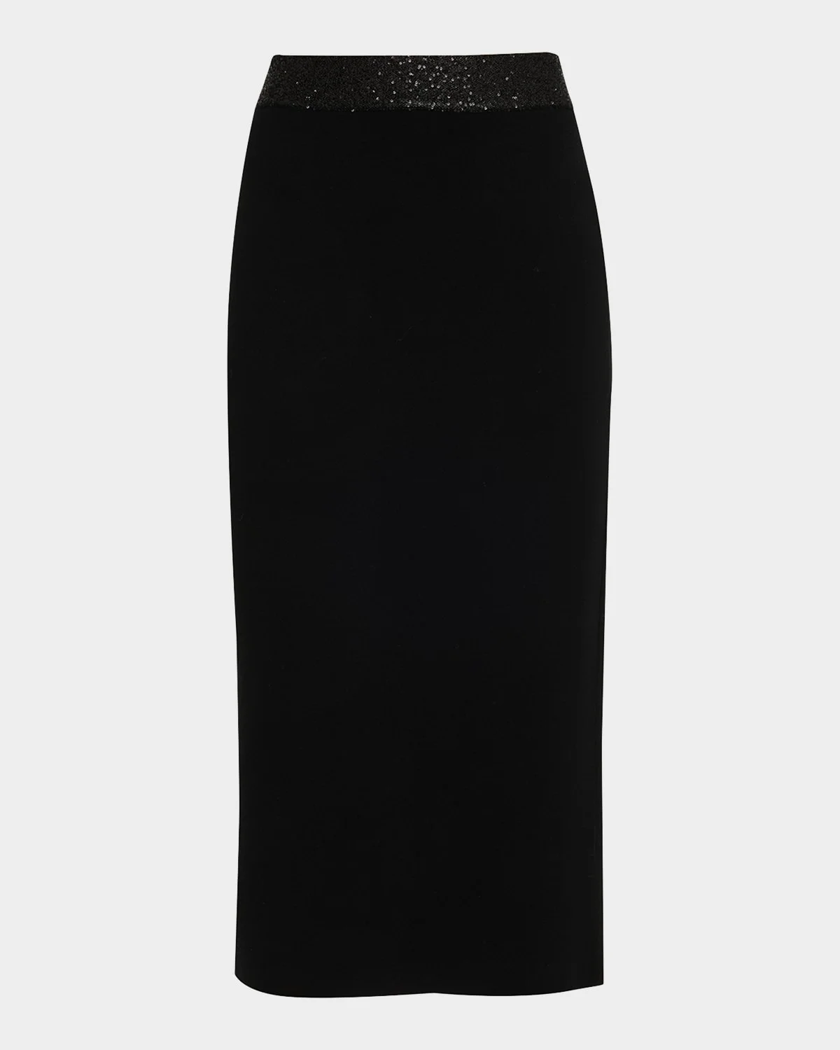 A.L.C. "Jane" knit midi skirt featuring an embellished waistband High rise Elastic waistband Bodycon fit Hem falls below the knee Pullon style Viscose/polyester Dry clean Imported