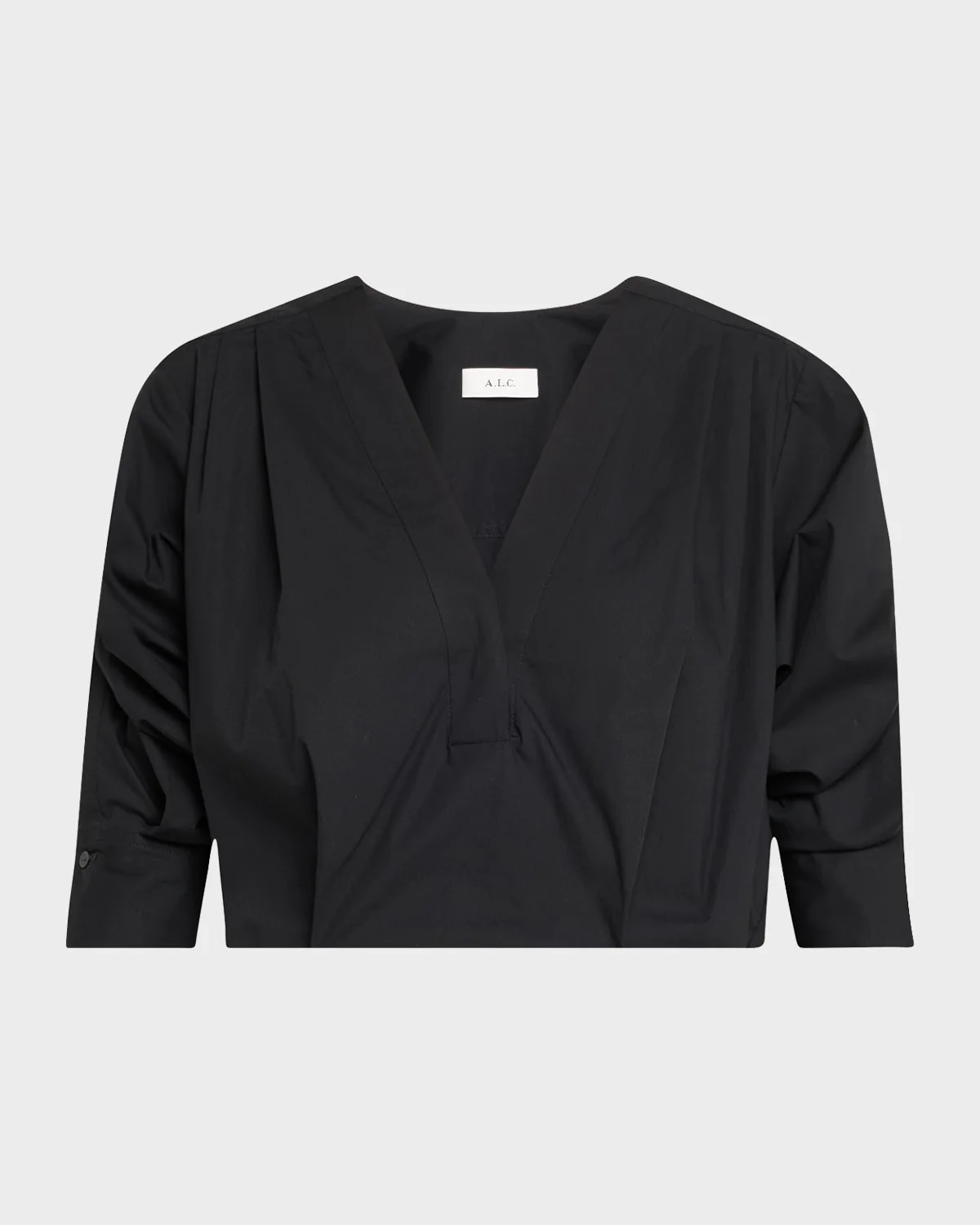 A.L.C. "Jordan" crisp cotton popover top V neckline Ruched sleeves with button cuffs Blouson fit Cropped elasticized hem Pullover style Cotton/elastane Unlined Dry clean Imported