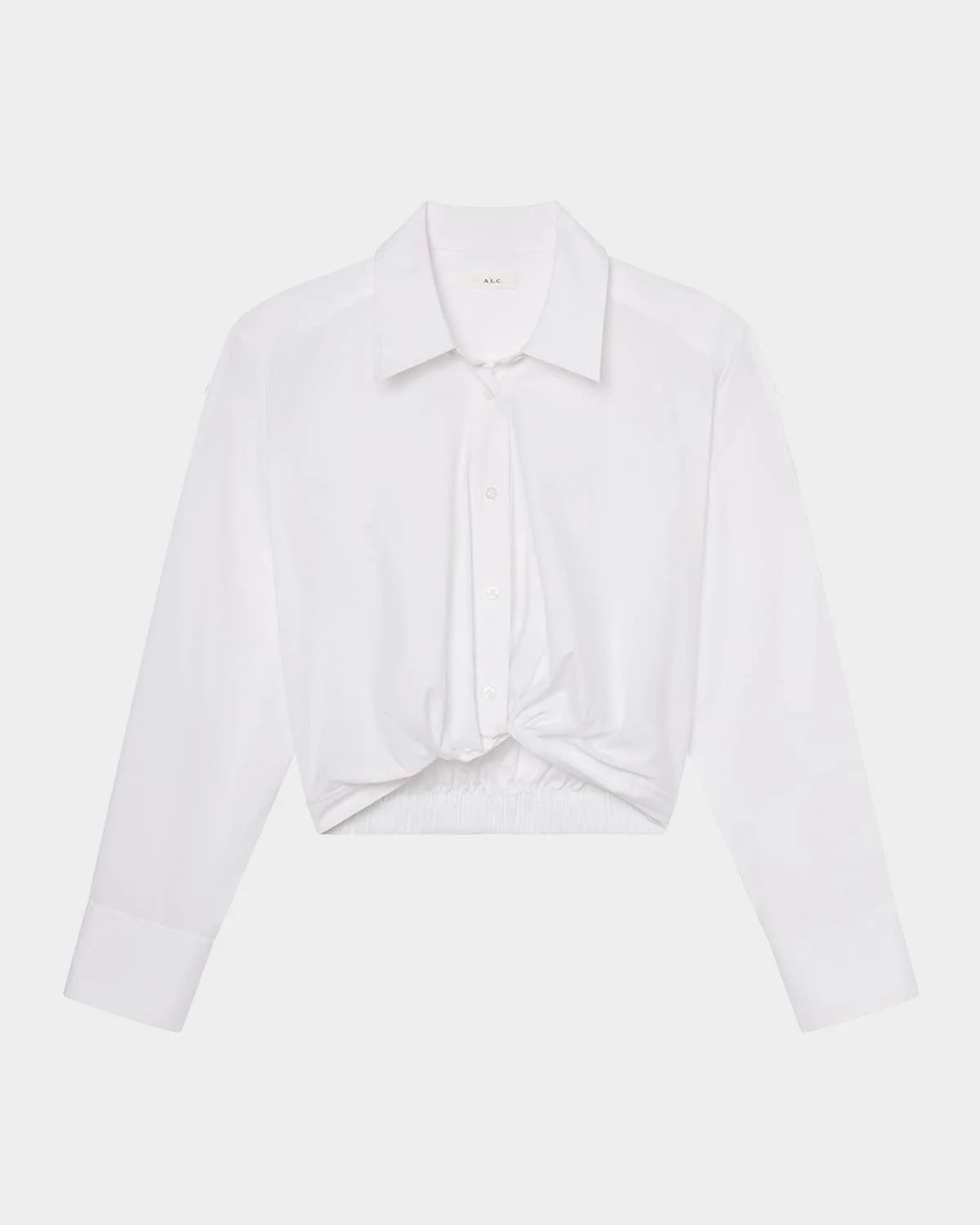 A.L.C. "Leo" cotton top featuring a gathered hem Point collar Long sleeves with button cuffs Classic fit Hem sits at the hip Buttonfront Cotton Unlined Imported