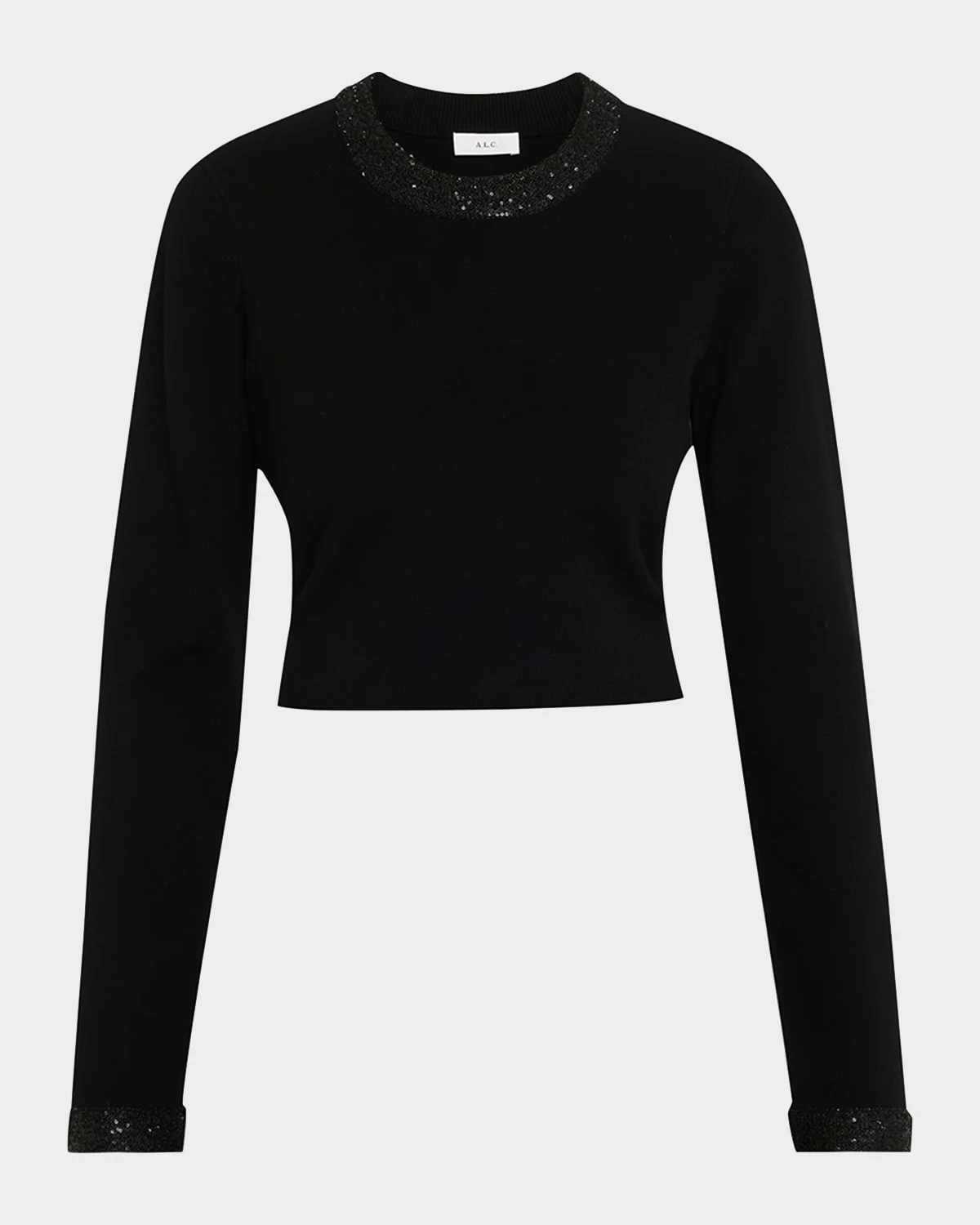 Crafted from compact viscose knit, the "Marley" top by A.L.C. is adorned with sequinembellished trim for a touch of glamour and shine. Crew neckline Long sleeves Cropped fit Pullover style Viscose/polyester Dry clean Imported