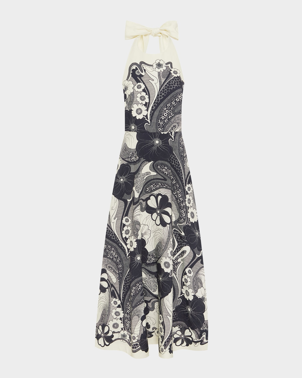 - ALEMAIS "Mickey" dress in a two-tone multi-pattern print - Halter neckline; self-ties behind the neck - Sleeveless - Low-cut back - Hem falls below the knee - A-line silhouette - Silk/linen - Imported