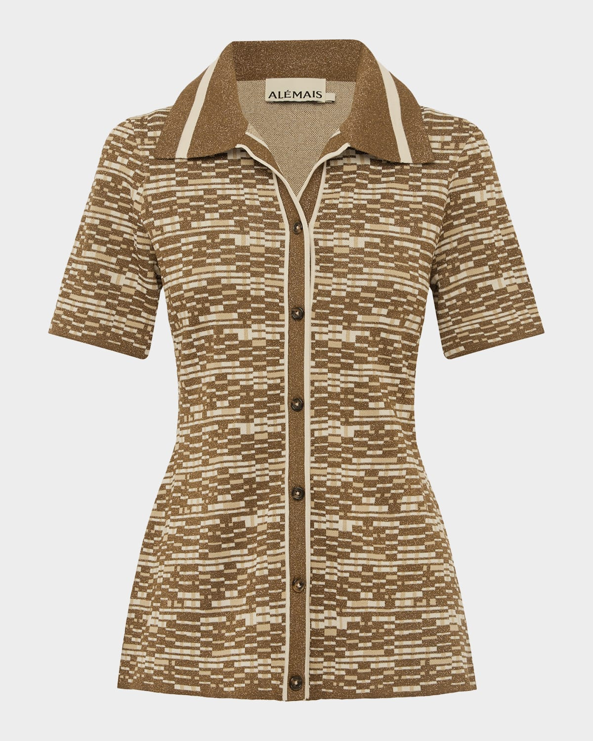 Knit in a geometric pattern with contrasting striped trim, the "Stefanie" shirt by ALEMAIS is finished with flecks of metallic for a hint of shimmer Spread collar Short sleeves Fitted Hip length Button front closure Viscose/metallic fibers Imported
