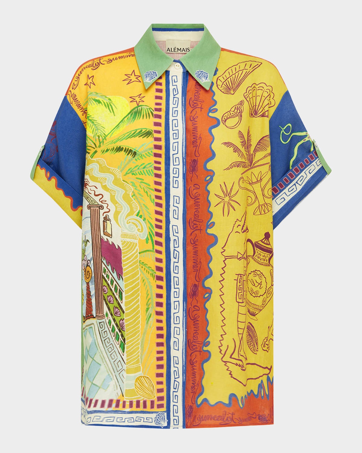 - ALEMAIS shirt illustrated with artwork created in collaboration with Sam Pauletto - Point collar - Elbow-length sleeves; roll-tab cuffs - Hip length - Relaxed fit - Concealed placket with self-covered buttons - Linen - Imported