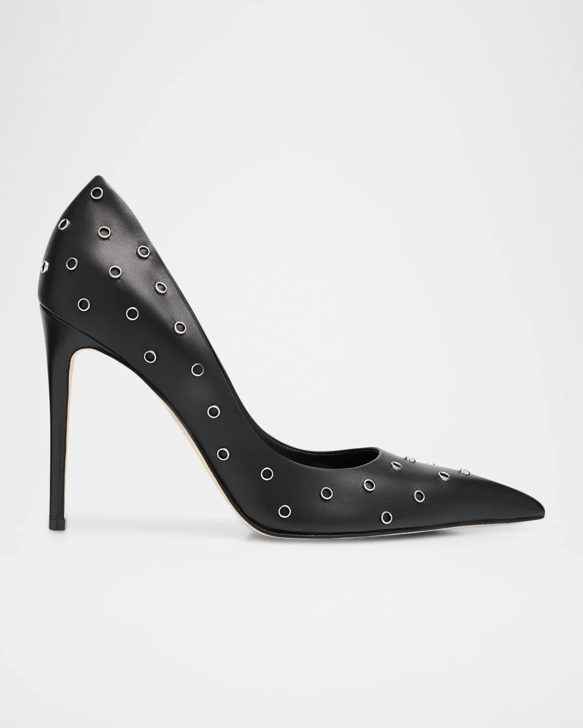 These pumps by McQueen are crafted from smooth leather with silvertone metal studding 4.00 in / 105 mm stiletto heel Pointed toe Slipon style Made in Italy