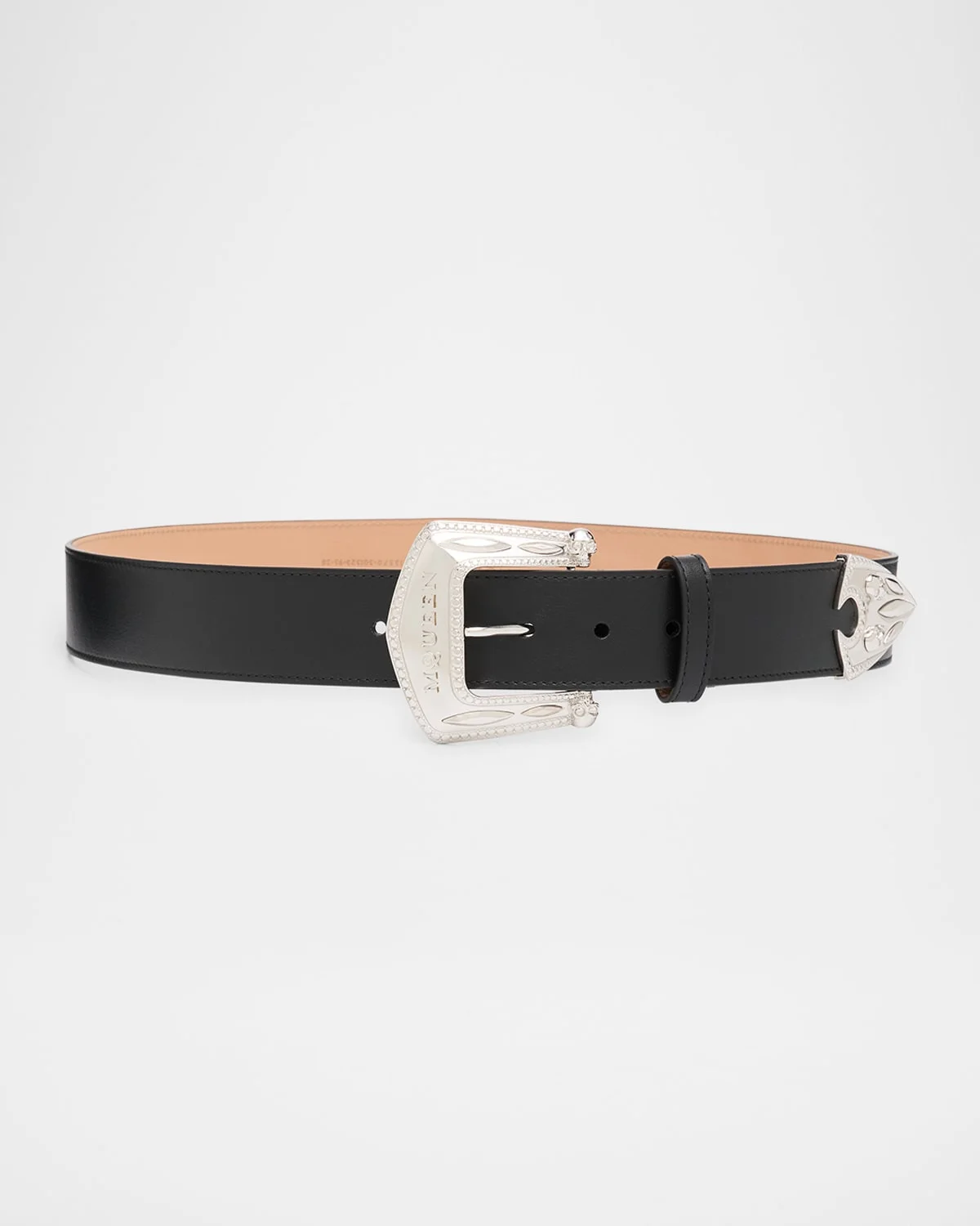 - McQueen leather belt featuring an oversized silver-tone buckle and arrow tip embellished with skulls for a statement look - Adjutable fit - Made in Italy