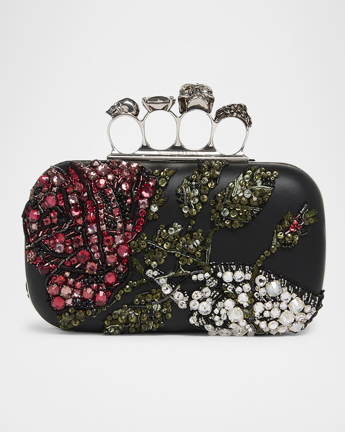 - McQueen clutch bag in leather blooms with crystal and beaded florals - Detachable chain shoulder strap - Framed top with signature embellished skull four-ring knuckle duster; lift-clasp closure - Approx. 5.1"H x 7.1"W x 2"D - Made in Italy