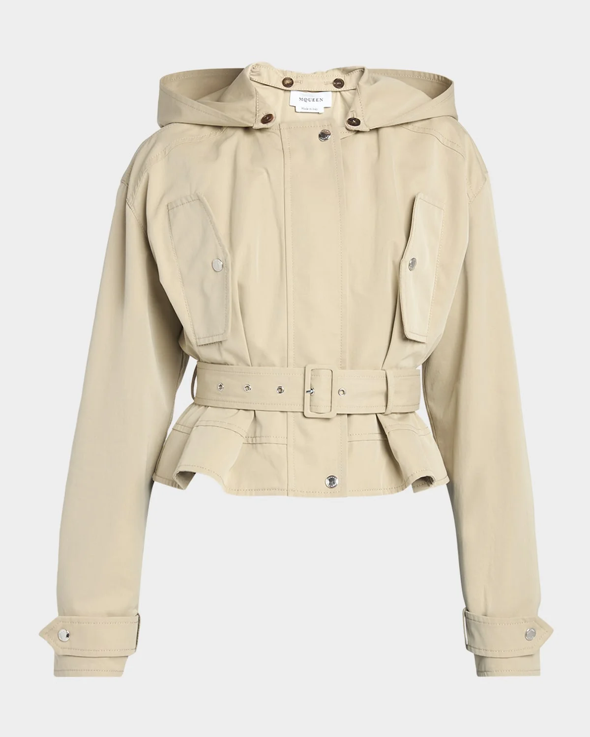Crafted from techno cotton, this windbreaker jacket from McQueen features a detachable hood and a self belt cinched waist Round neckline; snap-concealed zip front Long sleeves; snap-tab cuffs Chest snap-flap pockets Belted waist Relaxed fit Hip length Cotton Made in Italy SIZE & FITModel measurements: 5 & apos;10" tallModel is wearing a US size 4/Small