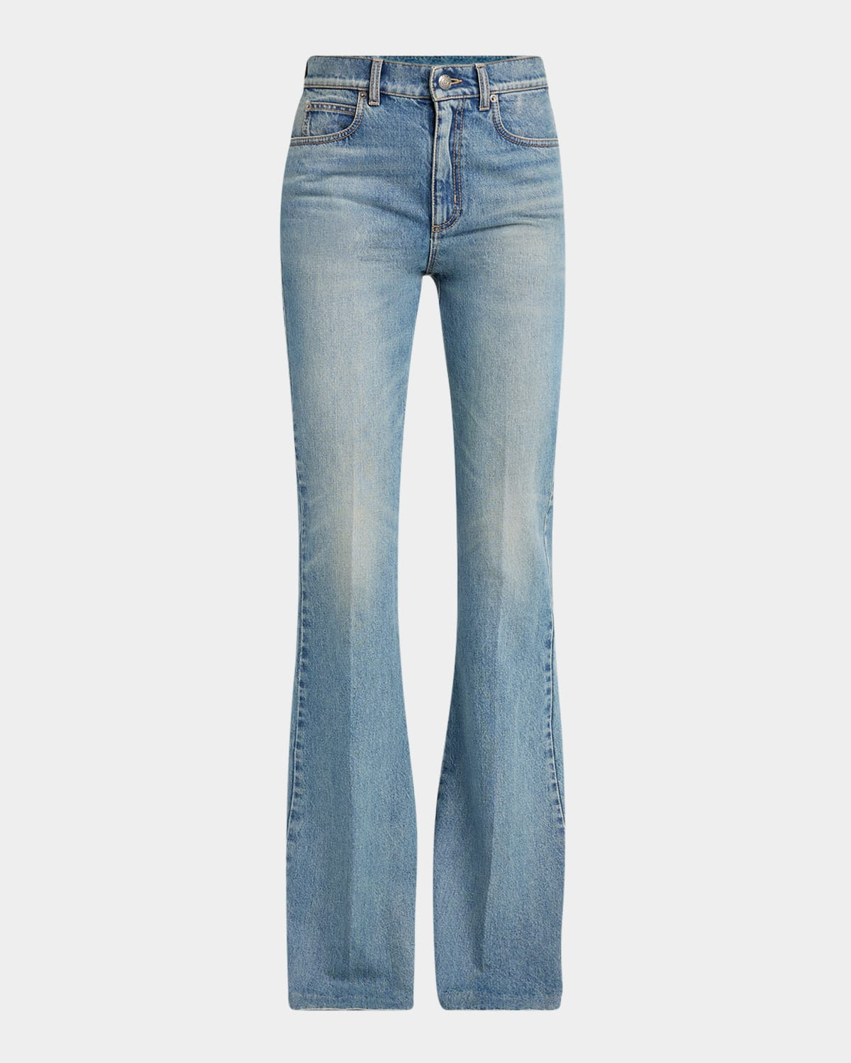 - McQueen denim pants with light whiskering - High rise - Five-pocket style - Boot-Cut legs - Full length - Button/zip fly; belt loops - Cotton - Made in Italy