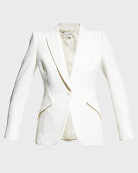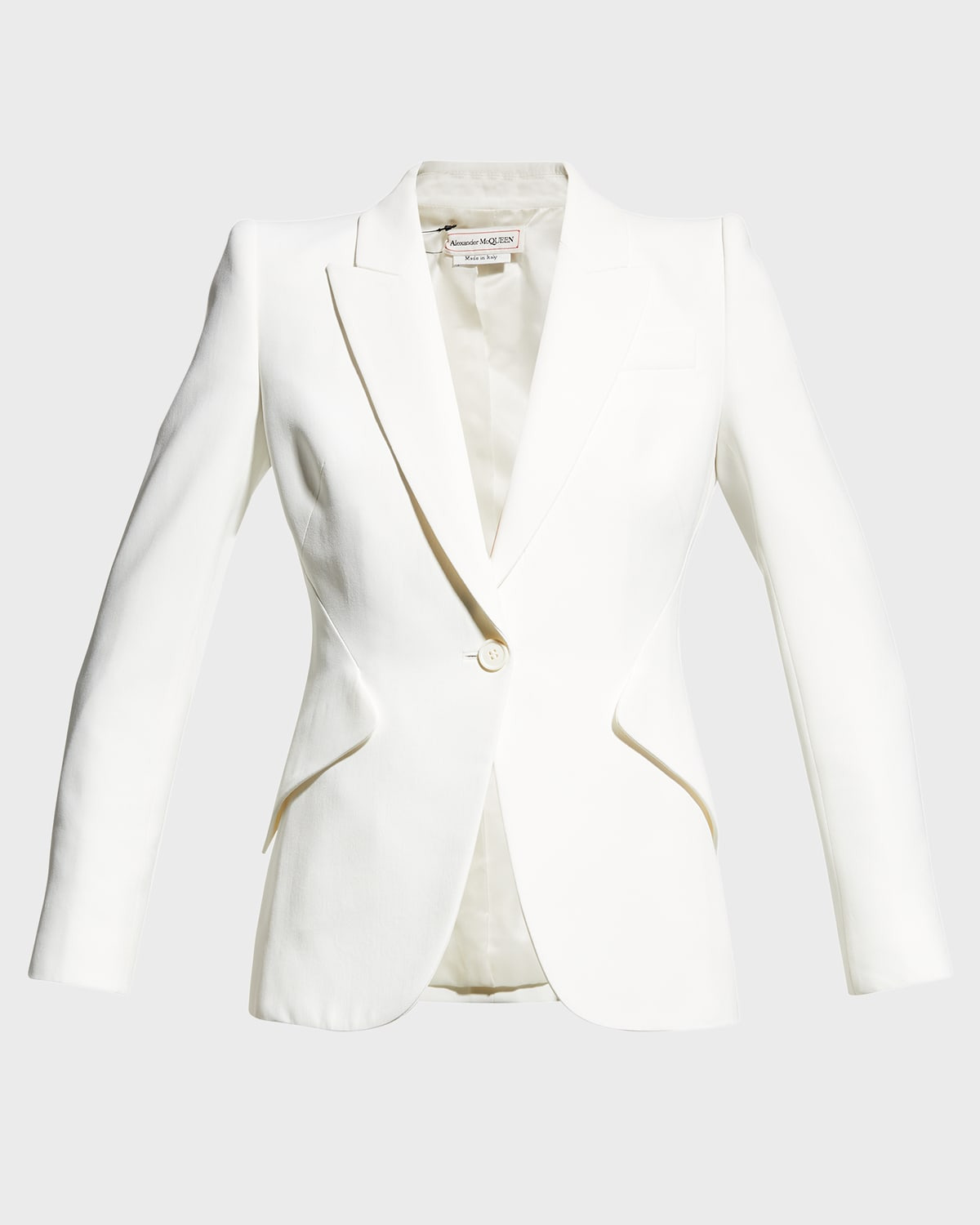 McQueen jacket in leaf crepe suiting. Approx. length: 28" from shoulder to hem Peaked lapels; onebutton front. Long sleeves finished with four kissing buttons. Angled flap pockets at waist. Tailored fit. Double vent. Viscose/acetate. Dry clean Made in Italy. Size Note:Model height: 5'10"/178cm Item runs small, consider ordering a size up.