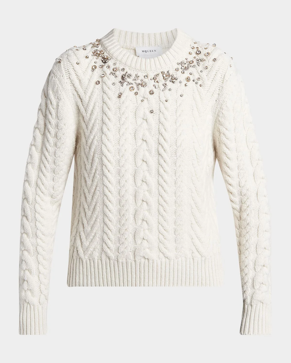 McQueen sweater is crafted from cashmere-blend & nbsp;cable knit accented with degrade crystal emellishment Crew neckline Long sleeves Relaxed fit Ribbed cuffs and hem Pullover style Wool/cashmere Dry clean Made in Italy