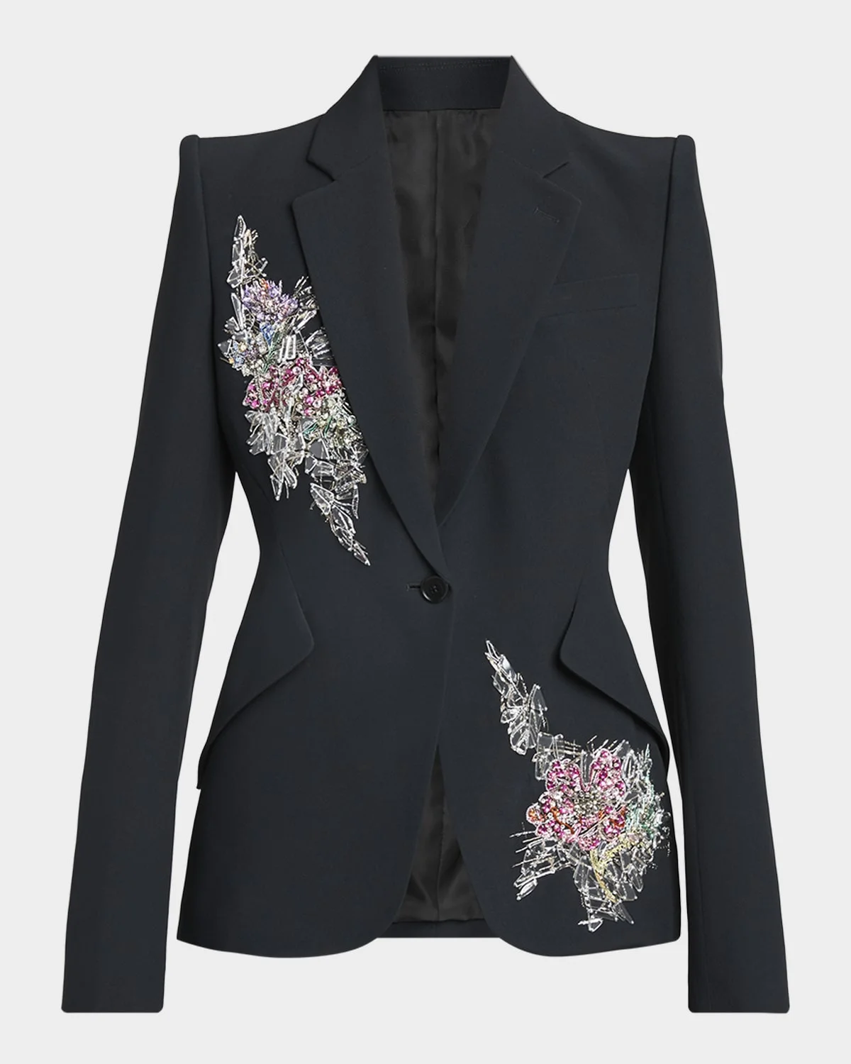 Crafted from leaf crepe, this blazer jacket from McQueen is adorned with floral crystal embroidery and a signature chain toggle detail on the back Notch lapels; single-breasted front Long sleeves; button cuffs Padded shoulders Chest welt pocket Hip flap pockets Slim fit Hem falls below the hip Double walking vent back Viscose/acetate Made in Italy