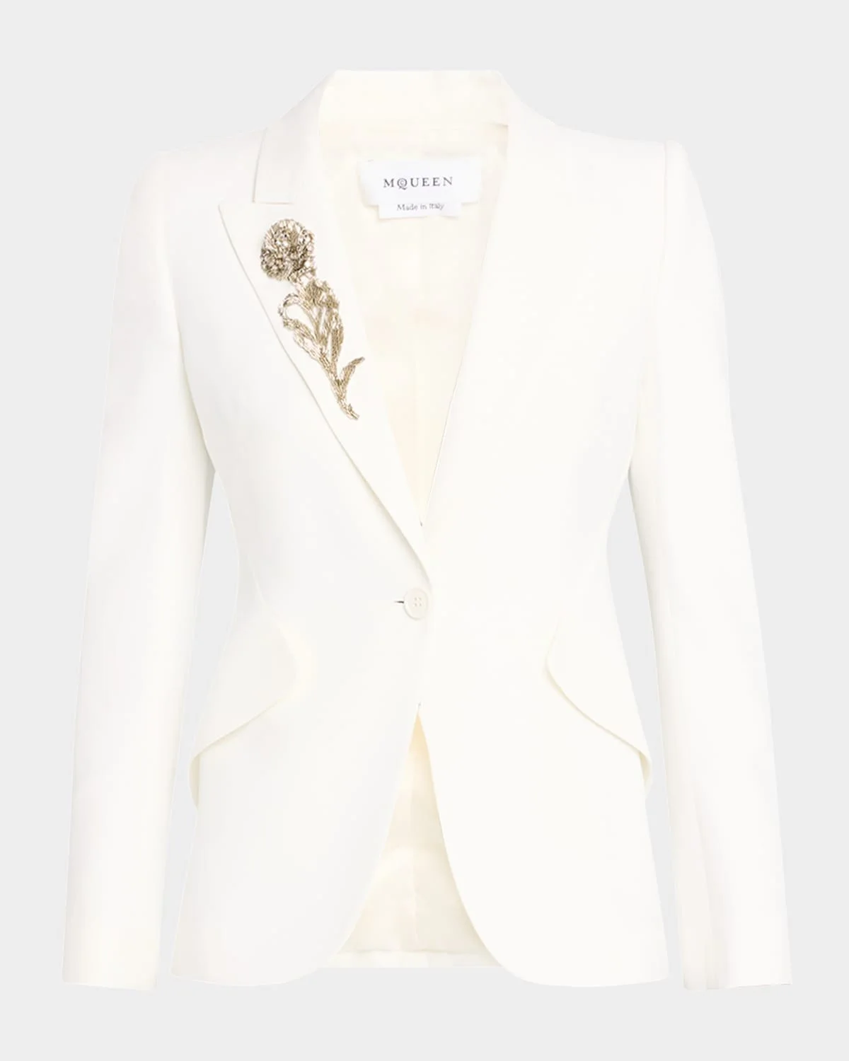 - McQueen sculpted blazer jacket featuring a flower bead and crystal embroidered lapel - Peka lapels; single-breasted front - Long sleeves; button cuffs - Padded shoulders - Chest welt pocket; side flap pockets - Slim tailored fit - Double vented-hem - Viscose/acetate - Dry clean only - Made in Italy