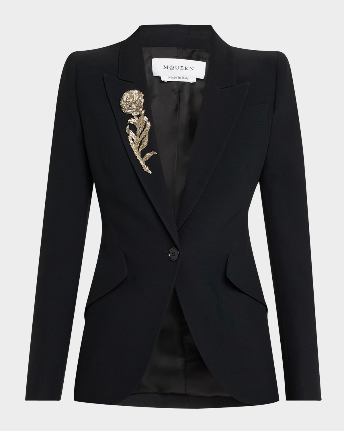 - McQueen sculpted blazer jacket featuring a flower bead and crystal embroidered lapel - Peka lapels; single-breasted front - Long sleeves; button cuffs - Padded shoulders - Chest welt pocket; side flap pockets - Slim tailored fit - Double vented-hem - Viscose/acetate - Dry clean only - Made in Italy