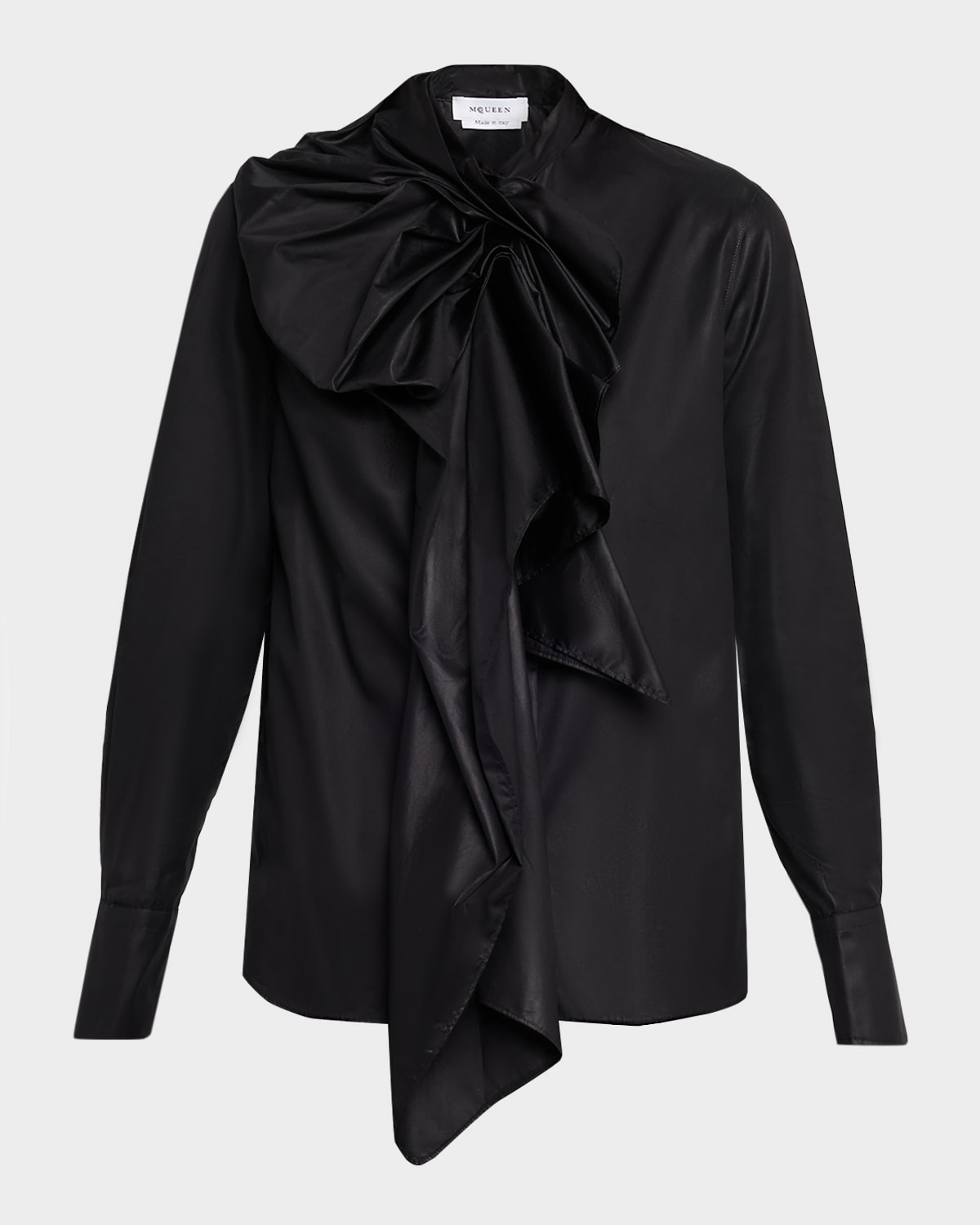 Elevated with an extravagant cascade of ruffles that drape fluidly from the neckline, this crisp poplin blouse by McQueen brings couturelevel drama to a classic shirt silhouette High neckline; concealed button front Long sleeves; button cuffs Relaxed fit Hip length Cotton Made in Italy