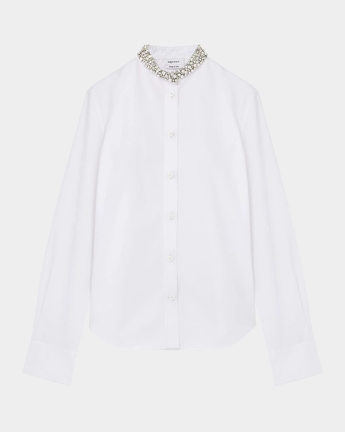 - Offering an elevated take on a classic silhouette, this shirt by McQueen features a crystal-embellished collar - Collared neckline; button front - Long sleeves; button cuffs - Yoked back - Relaxed fit - Hip length - Cotton/mother-of-pearl - Made in Italy