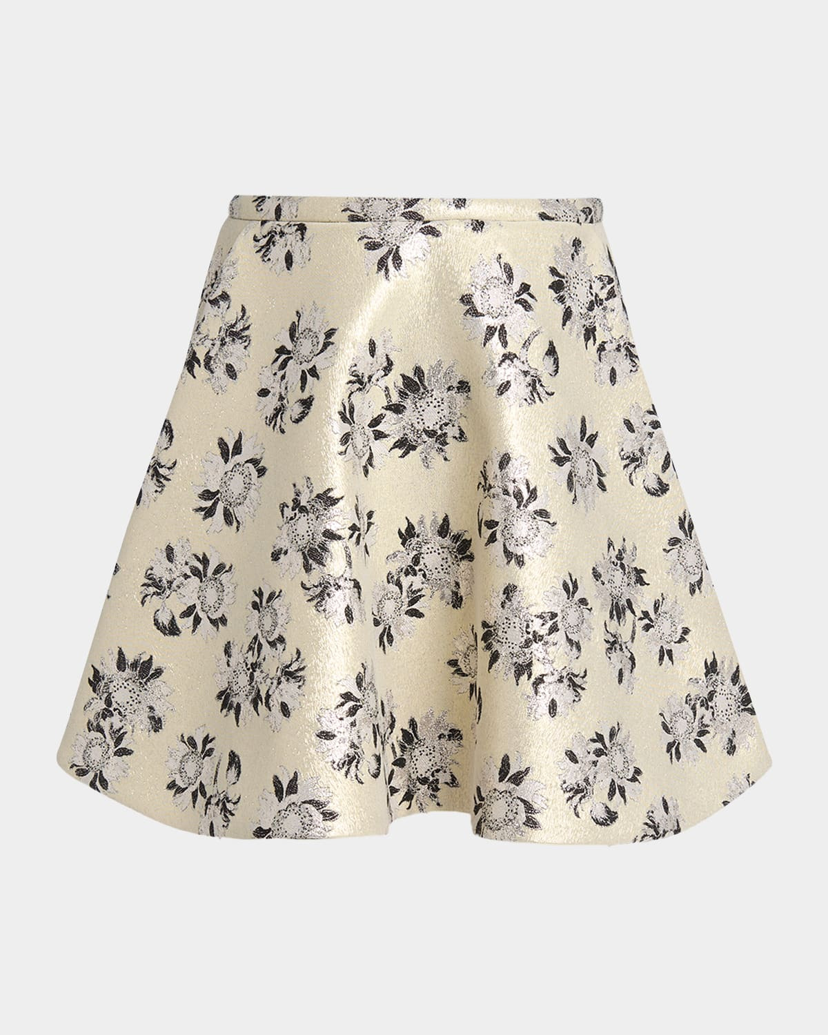 McQueen skirt is crafted of a metallic floral brocade featuring a flare ruffle front panel High waist Angled side slip pockets Mini length Flare silhouette Invisible back zip Polyester Dry clean Made in Italy