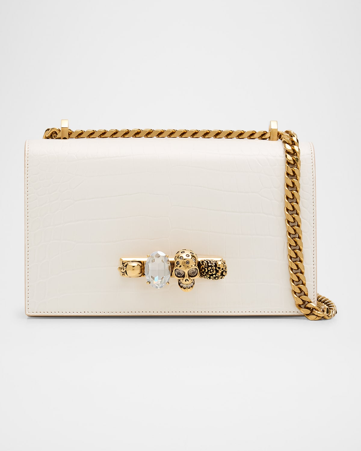 - McQueen crocodile-stamped leather satchel bag. - Chain and flat shoulder strap. - Signature skull and jewel detail. - Flap top with snap-lock closure. - Interior, one slip pocket and one zip pocket. - Approx. 5.7"H x 9.4"W x 3.1"D. - Made in Italy.