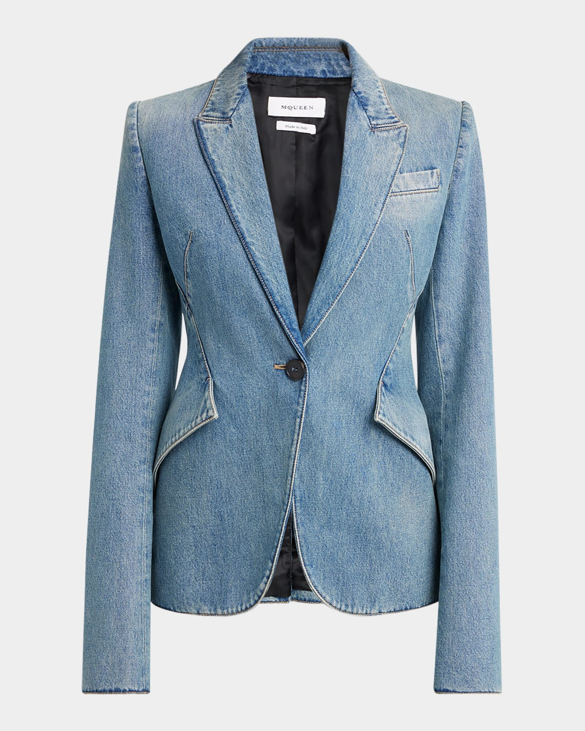 McQueen faded light wash denim blazer structured with padded shoulders and a slim waist Peak lapels; onebutton front Long sleeves; button cuffs Chest welt pocket; waist flap pockets Fitted Back walking vent Cotton/elastane Made in Italy
