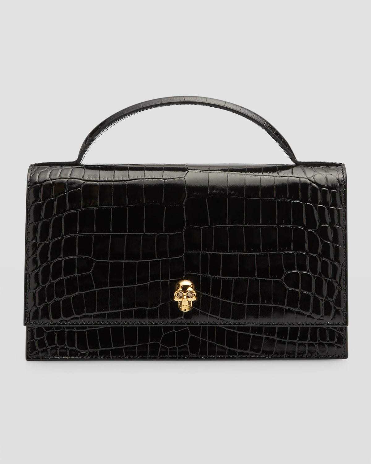 - McQueen top handle bag in croc-embossed calf leather - Features signature skull - Flat top handle - Detachable chain crossbody strap - Can be worn as a top handle or crossbody bag - Flap top with magnetic closure - Exterior, back slip pocket - Interior, one card slot - Approx. 9.3"H x 7.9"W x 2.4"D - Made in Italy
