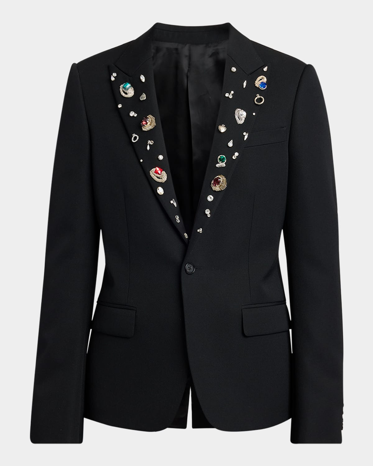 - McQueen barathea reverse jacket with crystal-embellished lapels - Signature Cross-Bar chain at back - Peak lapels - Single-button closure - Chest pocket - Hip flap pockets - Long sleeves - Four-button cuffs - Center back vent - Wool - Dry clean - Made in Italy