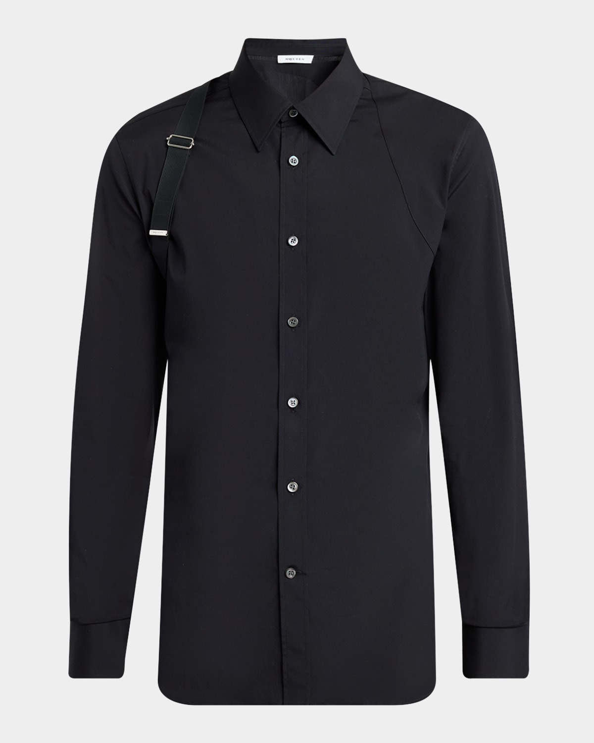 - McQueen solid dress shirt with shoulder harness - Point collar - Tonal button placket - Long sleeves - Squared barrel cuffs - Shirttail hem - Cotton - Dry clean - Made in Italy