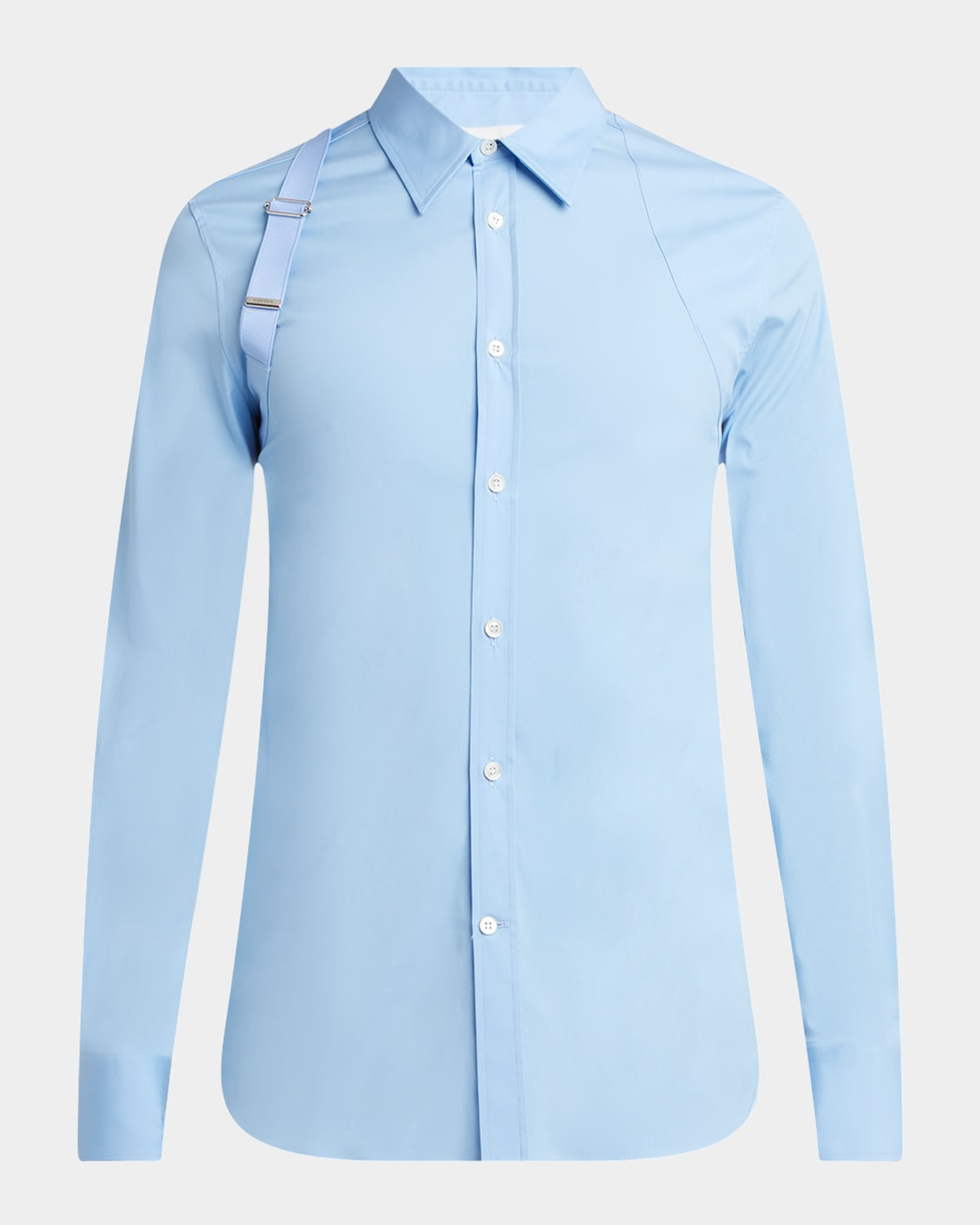 - McQueen solid dress shirt with shoulder harness - Point collar - Tonal button placket - Long sleeves - Squared barrel cuffs - Shirttail hem - Cotton - Dry clean - Made in Italy