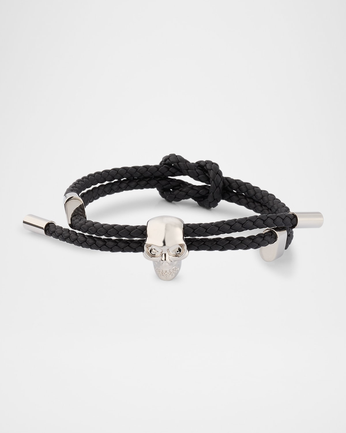 - McQueen bracelet defined by woven leather cords - Silvertone brass - Signature skull charm - Pull closure - Adjustable fit - Spot clean - Made in Italy