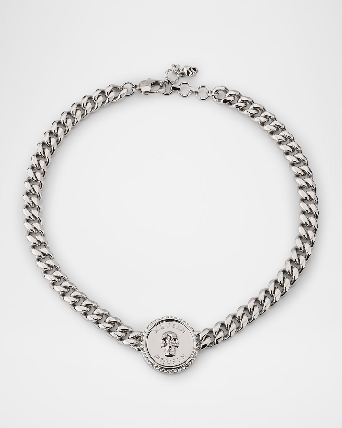 - McQueen chain choker necklace - Necklace length: - approx. 13.7 inches - Silvertone brass hardware - Integrated coin medallion with high relief skull, engraved logo and clear crystal border - Extended adjustable length - Lobster clasp closure - Made in Italy