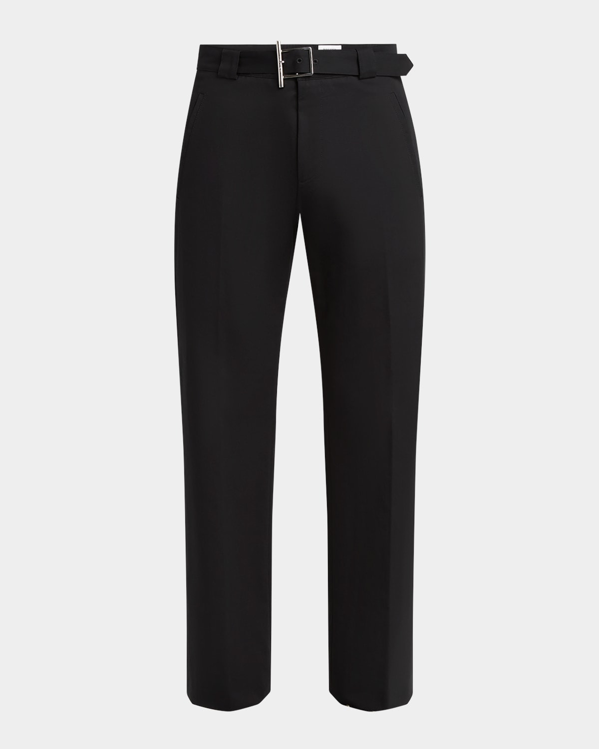 - McQueen trousers made from technical fabric are accented with a silvertone T-bar belt - Built-in belted waist - Belt loops/zip front - Besom side pockets; back button-welt pockets - Straight legs - Full length - Cotton/nylon - Dry clean - Made in Italy