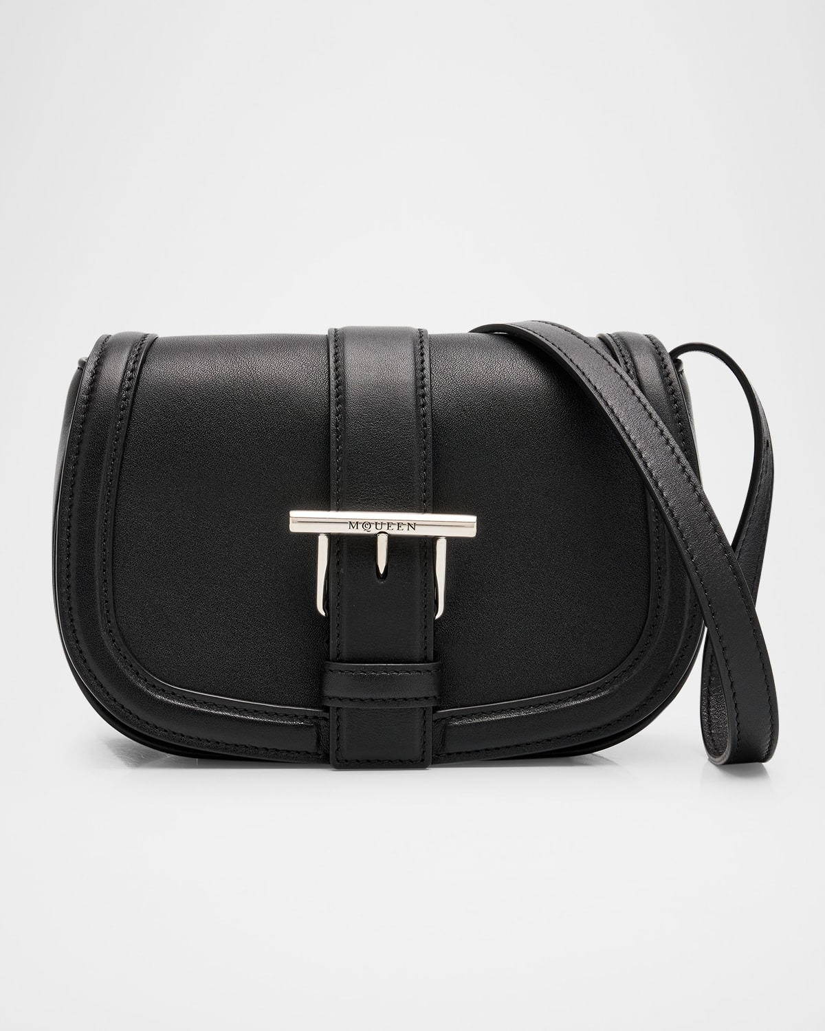 - McQueen saddle crossbody bag in leather - Adjustable crossbody strap - Flap top with T bar buckle magnetic closure - Interior, one slip pocket - Approx. 5.1"H x 7.4"W x 1.9"D - Made in Italy