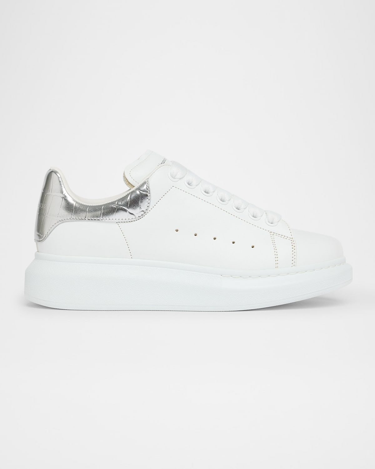 - A statement silhouette from McQueen, these oversized sneakers are punctuated with metallic snakeskin-embossed leather trim, striking a balance of street and sophistication - 1.50 in / 40 mm no flatform heel - Round toe - Lace-up vamp - Large flat laces - McQueen signature on the tongue and heel counter - Perforated sides - Contrast heel counter - Oversized rubber sole - Made in Italy