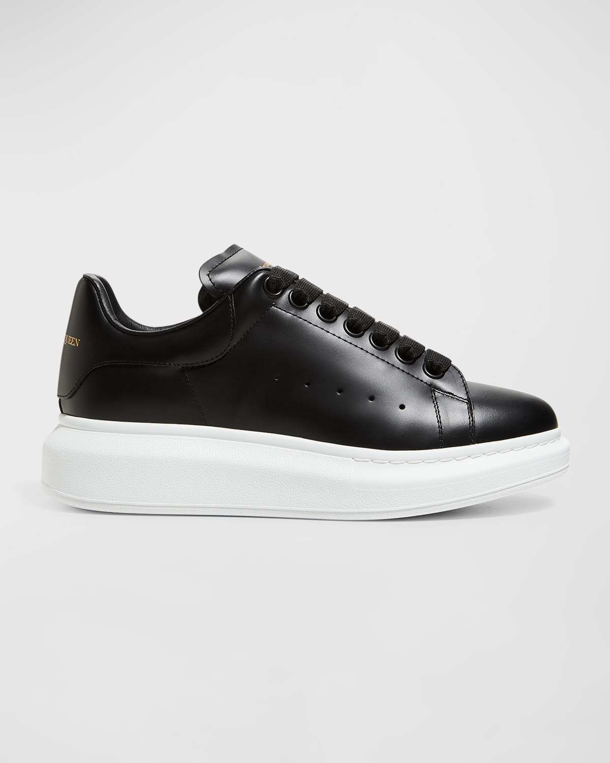 McQueen leather sneakers. 0.8" flat heel with platform. Round toe. Laceup vamp. Perforated side. Logo at tongue and backstay. Leather lining. Rubber outsole. Runs small, order one size up. Made in Italy.