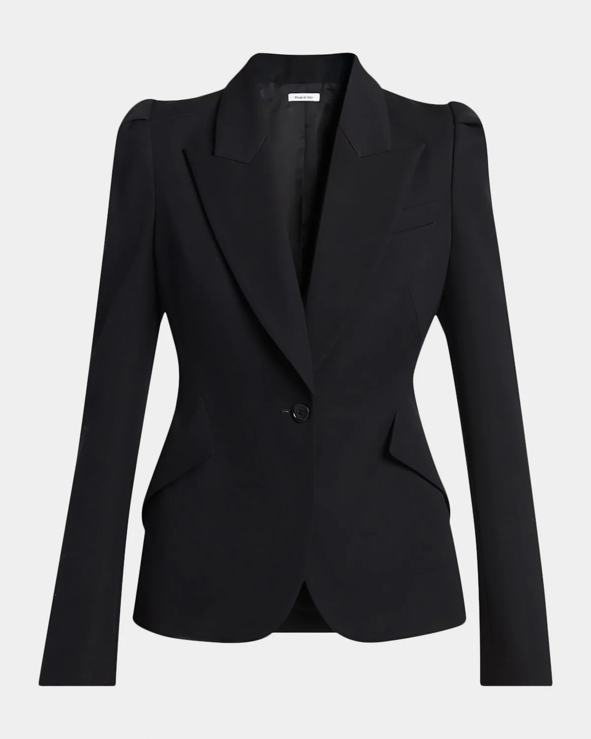 This McQueen jacket is slim and modern, cut from grain de poudre with geometric seaming and a back T-Bar chain accent Peak lapels Single-breasted front Puff shoulders Long sleeves Four-button cuffs Chest welt pocket Angled hip flap pockets Double-vented back Slim fit Wool/cupro Dry clean Made in Italy