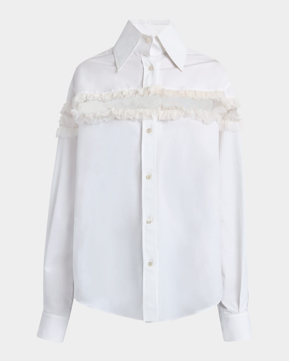 - McQueen blouse featuring a sheer shoulder inset embellished with ruffles - Point collar; button front - Long sleeves; button cuffs - Loose fit - Shirttail hem - Cotton/silk - Dry clean - Made in Italy