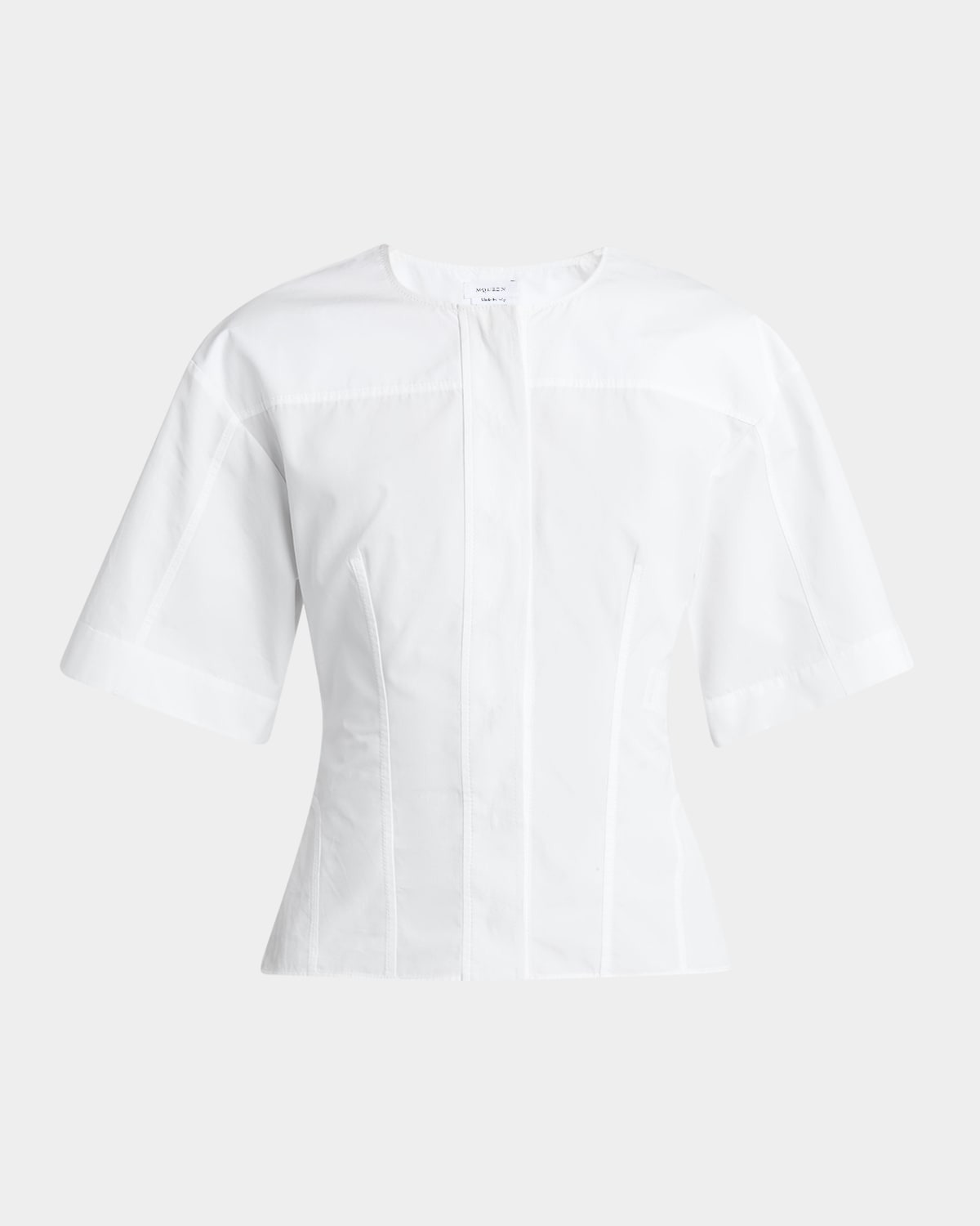 - McQueen poplin blouse featuring corsetry seaming detail - Crew neckline; concealed button front - Short sleeves - Slim fit - Cotton/mother-of-pearl - Made in Italy