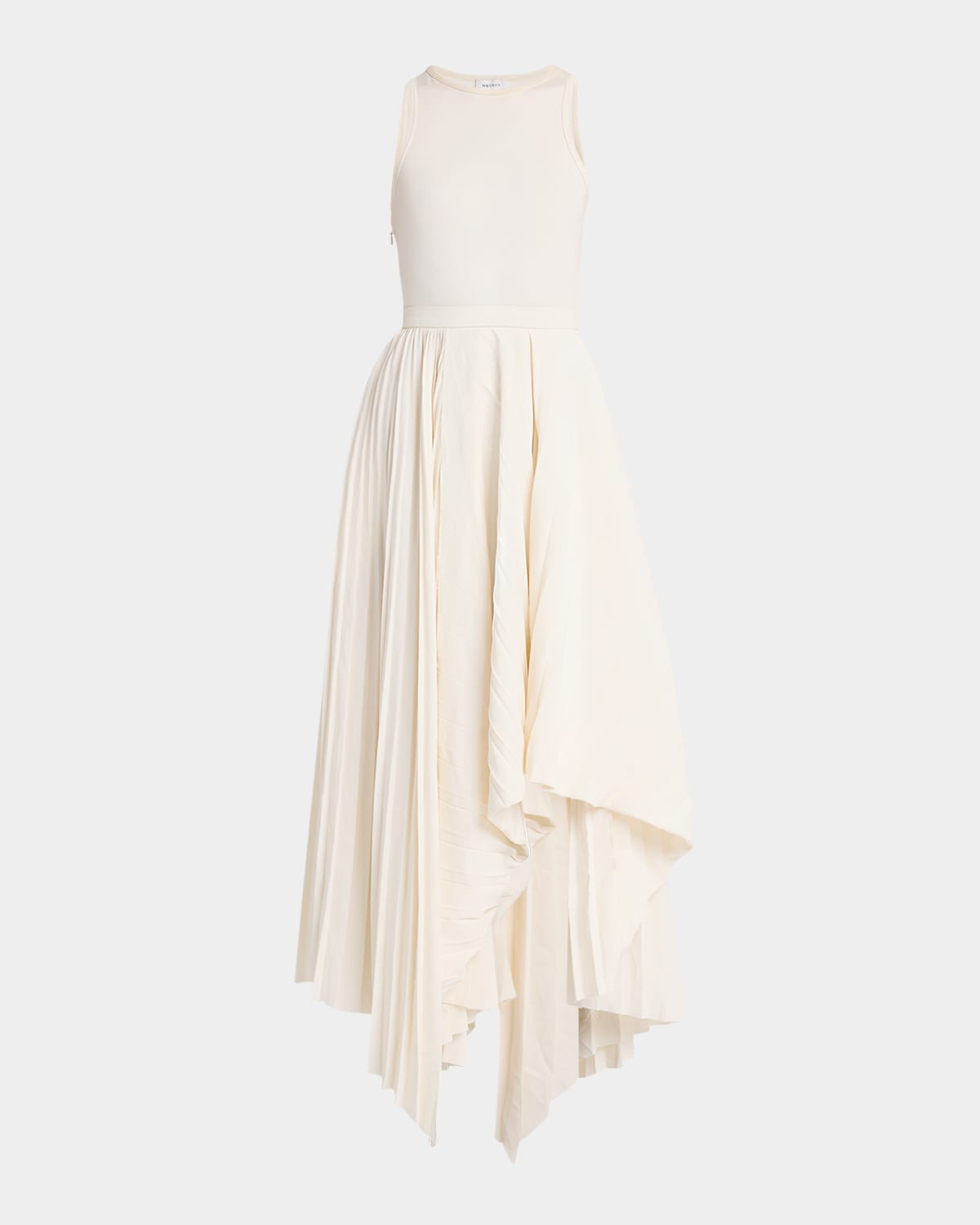 - McQueen jersey dress featuring a pleated skirt with asymmetric draping - High neckline - Sleeveless - Hem falls below the knee - A-line silhouette - High-low hem - Invisible side zip - Cotton - Dry clean - Made in Italy - Model is 5'10"/177cm.