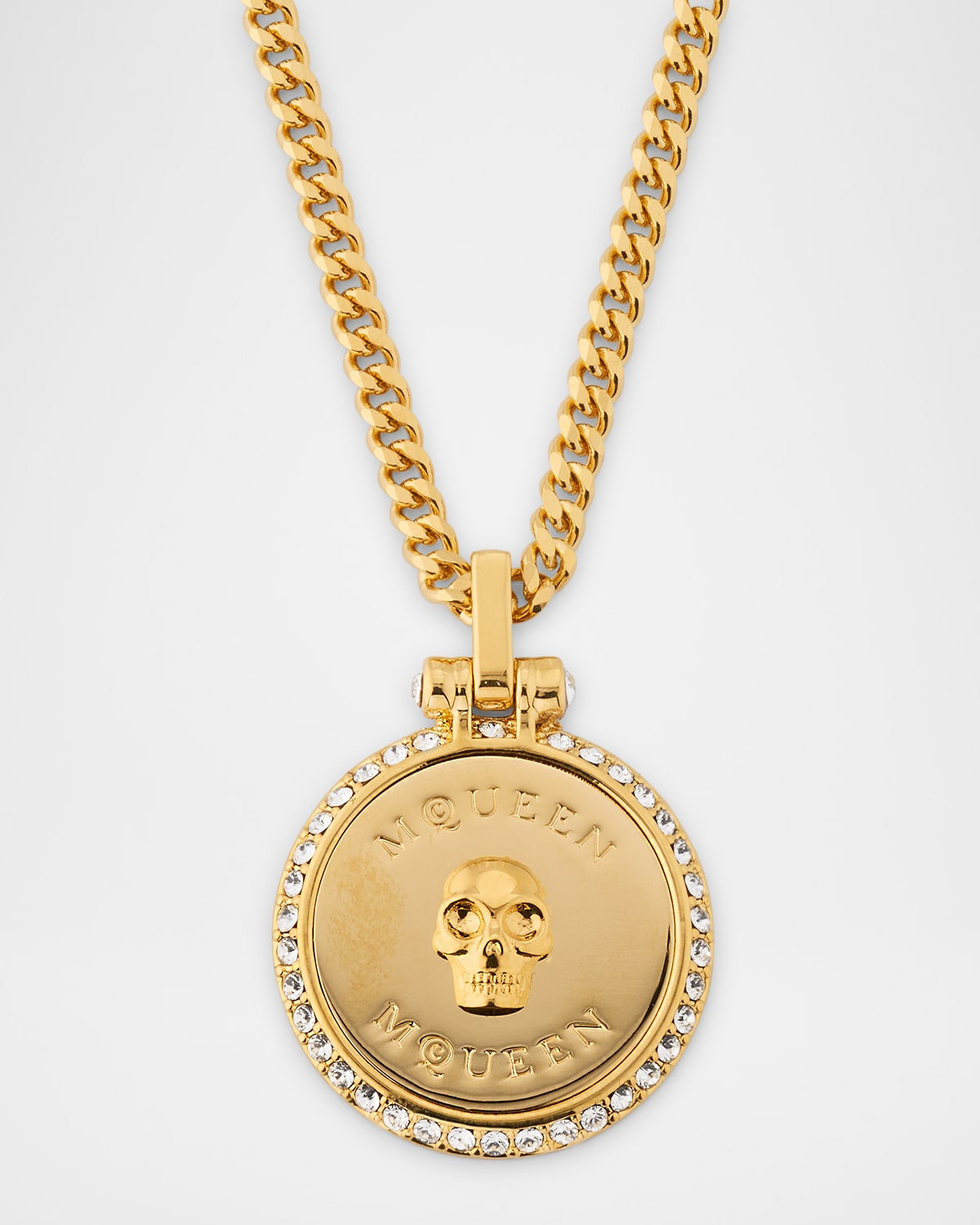 - Gold-finished chain necklace featuring a pendant with a high-relief skull and engraved with a double McQueen logo. Finished with a clear crystal border. - McQueen necklace - Gold-tone eco-brass hardware - Pave-set crystals - Adjustable length - Lobster clasp with skull charm - Made in Italy