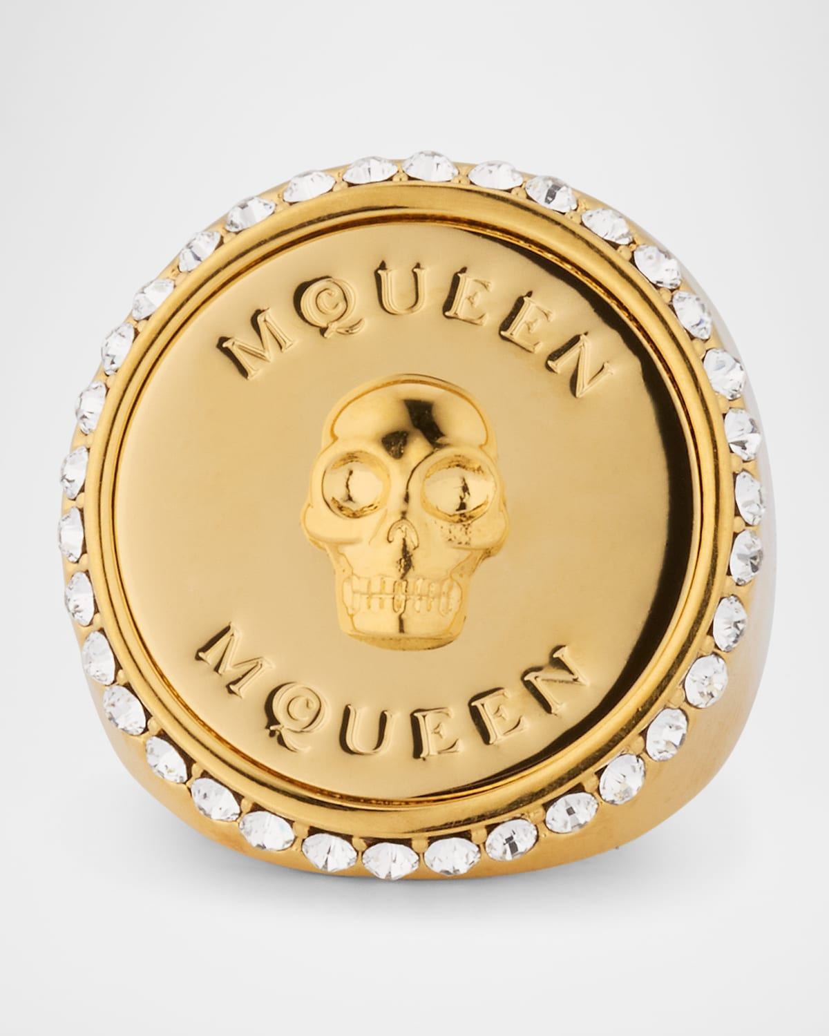- Gold-finished ring featuring a high-relief skull and engraved with a double McQueen logo. Finished with a clear crystal border. - McQueen ring - Gold-tone eco-brass hardware - Pave-set crystals - Made in Italy