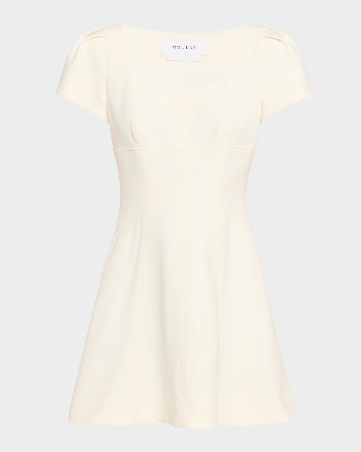 - McQueen day dress featuring an empire waist and shoulder pleats - Square neckline - Short sleeves - Mini length - A-line silhouette - Side zip - Wool/silk/nylon/polyamide - Made in Italy
